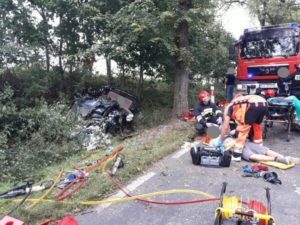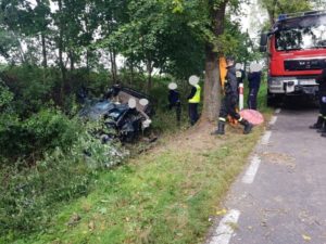Po dojeździe na miejsce zdarzenia Kierujący Działaniem Ratowniczym ustalił w przeprowadzonym rozpoznaniu, że samochód osobowy uderzył w przydrożne drzewo. Pojazd znajdował się w rowie.