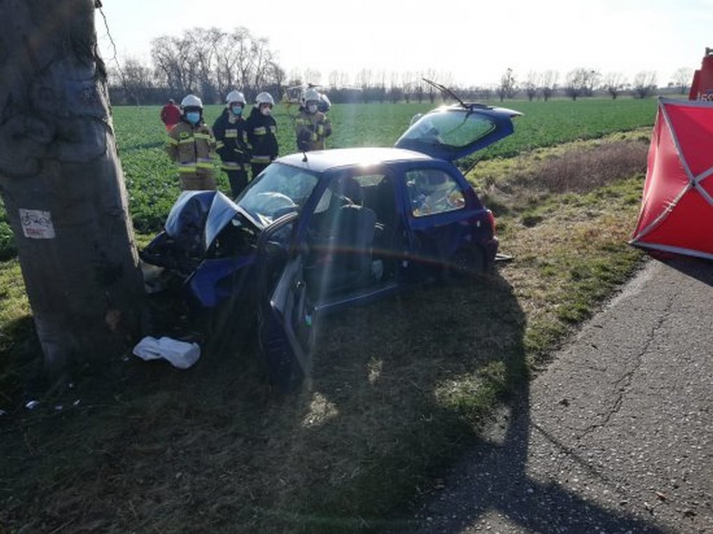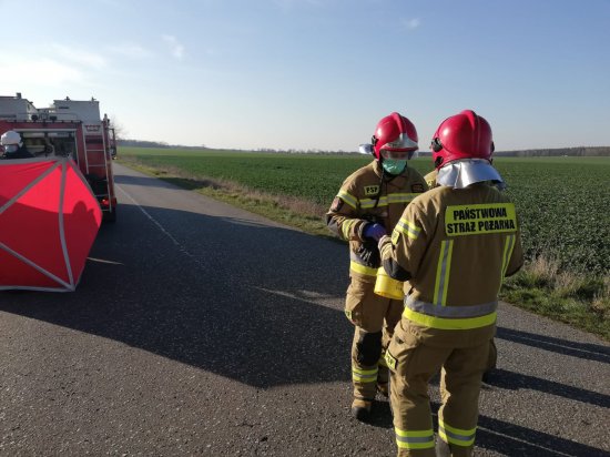 Zadysponowane zastępy JOP udały się na miejsce zdarzenia, gdzie po przybyciu stwierdzono, że auto uderzyło w drzewo a wewnątrz znajduje się kobieta zakleszczona, nieprzytomna. Decyzją Kierującego Działaniem ratowniczym zabezpieczono teren działań, wykonano stabilizację pojazdu i czynności pozwalające na bezpieczne wykonywanie czynności ratowniczych. Wyznaczono Kierującego działaniem medycznym a z uwagi na nagłe zatrzymanie krążenia podjęto decyzję o szybkiej ewakuacji osoby poszkodowanej z wraku pojazdu celem wykonania resuscytacji krążeniowo – oddechowej.Do czasu przybycia LPR wykonywano medyczne działania ratownicze przy pomocy defibrylatora AED. Po przybyciu LPR i czynnościach ratowników medycznych lekarz stwierdził zgon osoby kierującej pojazdem osobowym.Udział 4 zastępy JOP 20 ratowników, Policja,LPR.