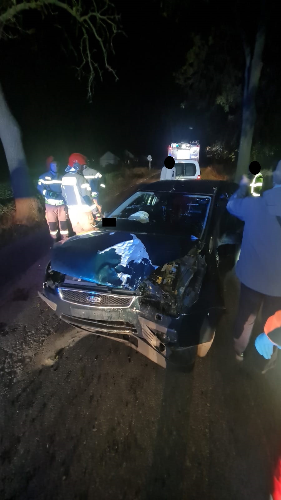 Po dojeździe na miejsce zdarzenia strażacy zastali samochód osobowy, który uderzył w drzewo. Osoby poszkodowane opuściły pojazdy przed przybyciem SP i znajdowały się w pobliżu pod opieką ratowników ZRM.