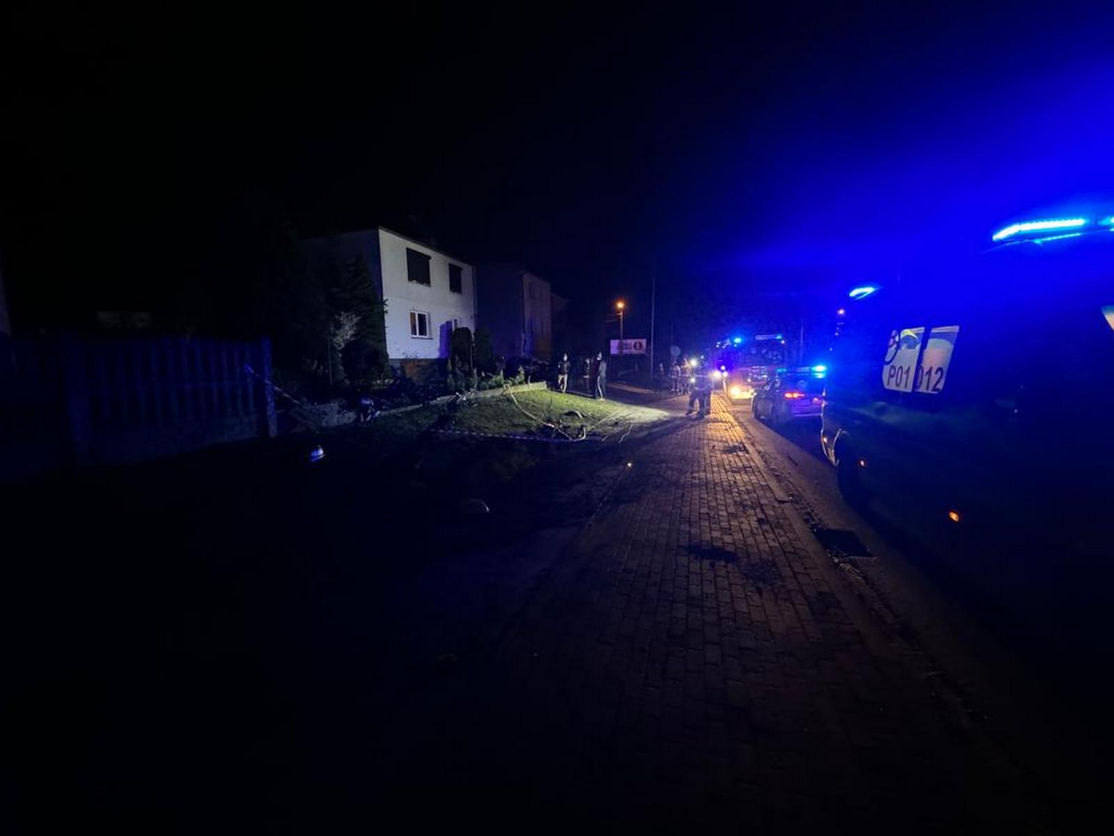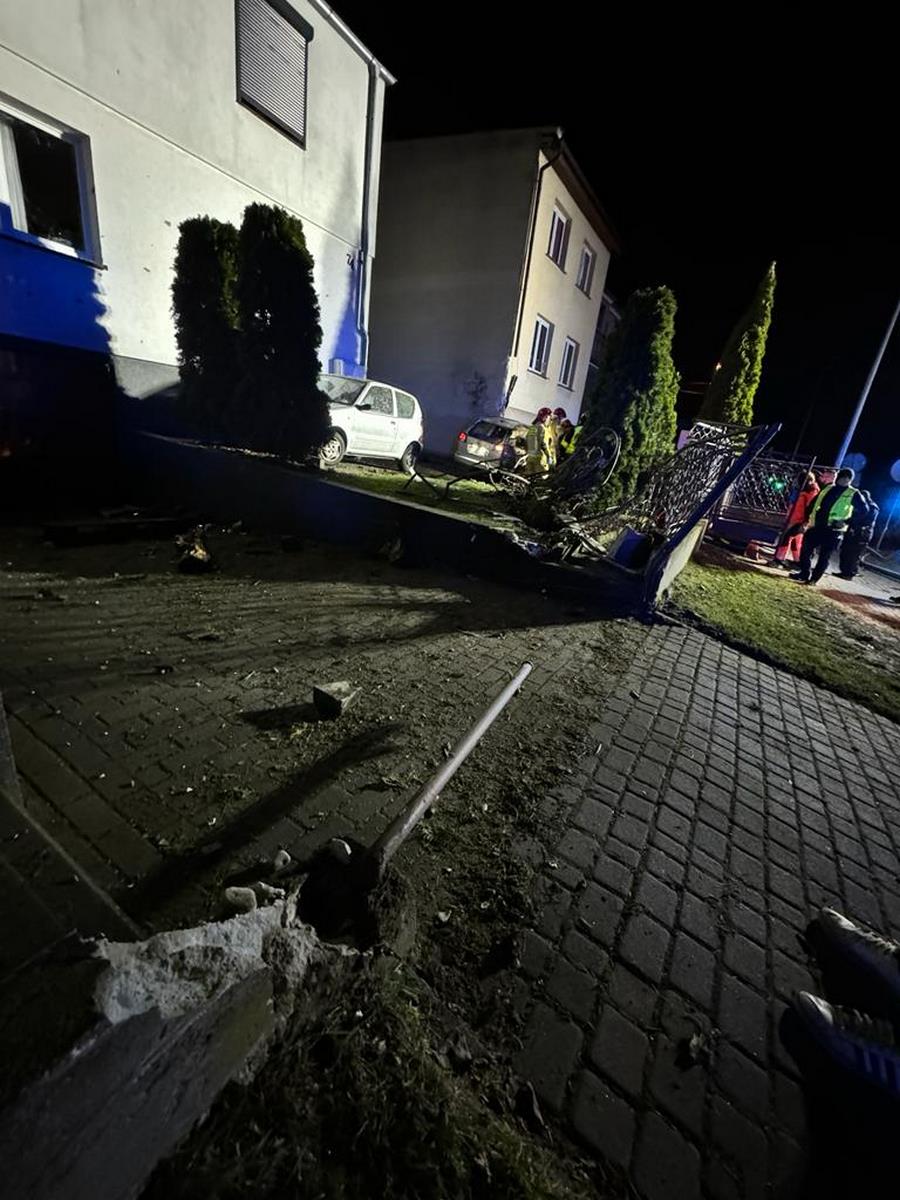 Auto ścięło przydrożną latarnię, uszkodziło ogrodzenia trzech posesji i zatrzymało się uderzając w budynek mieszkalny.