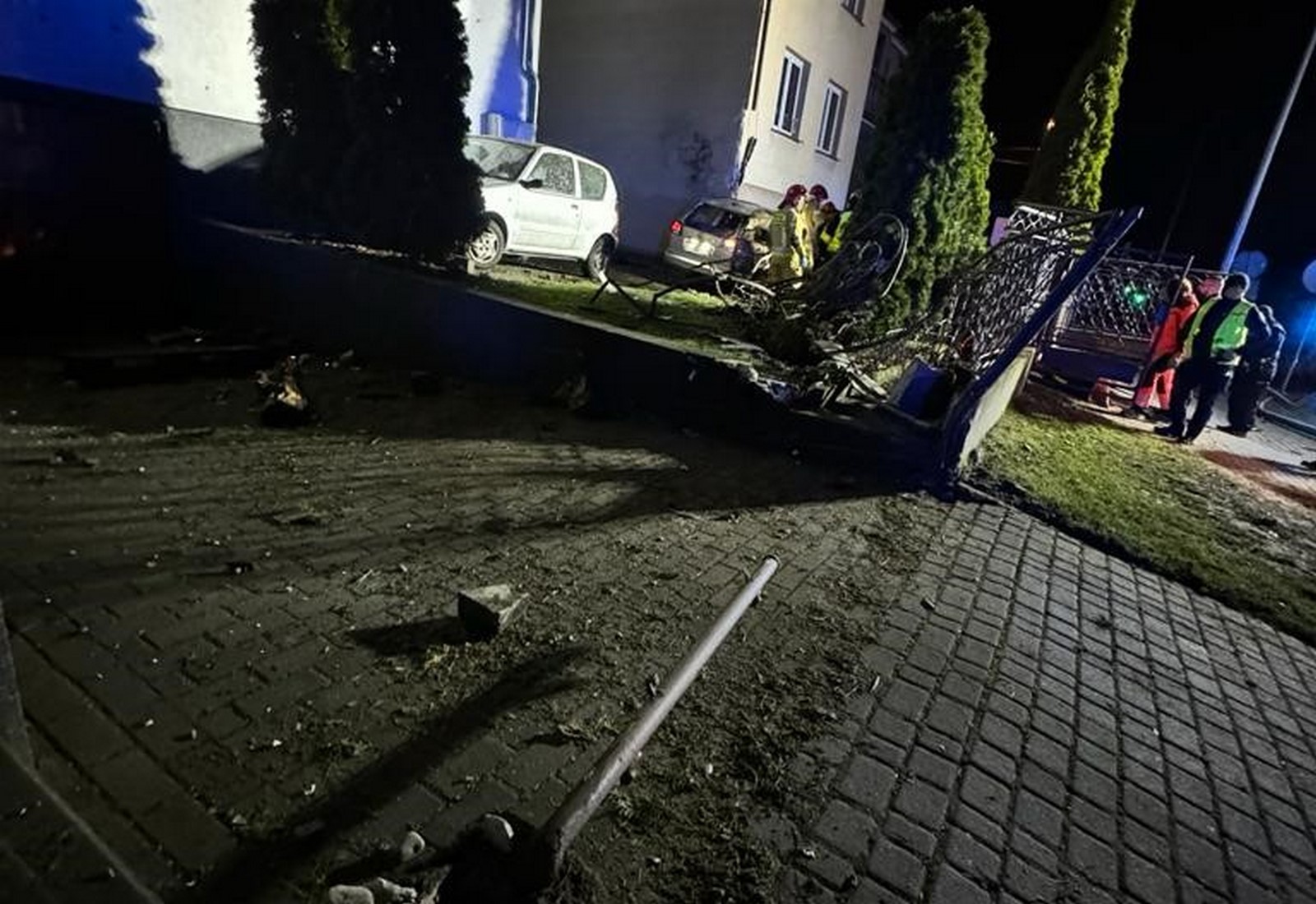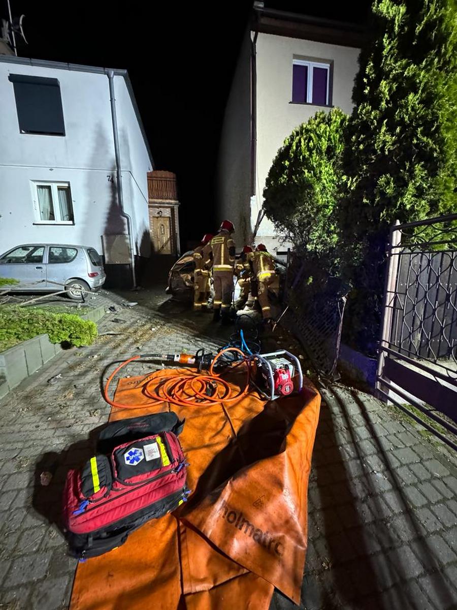 Na miejsce zdarzenia zadysponowano dwa zastępy z Jednostki Ratowniczo-Gaśniczej w Gnieźnie. Po przybyciu na miejsce zdarzenia pierwszego zastępu zastano samochód osobowy poza jezdnią w pozycji na kołach. Auto wcześniej ścięło przydrożną latarnię, uszkodziło ogrodzenia trzech posesji i zatrzymało się uderzając w budynek mieszkalny.