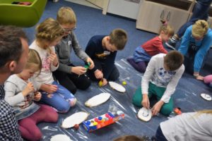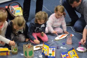(„Kłopoty babuleńki”, „Zaczarowany kalosz” i „Stoliczku nakryj się”). Czytanie bajek zakończyliśmy malowaniem ulubionych zwierząt na kawałkach – zdawałoby się niepotrzebnego już nikomu – drewna. W ten sposób na drewnianych krążkach powstały medaliony – portrety dziecięcych Ulubieńców. W malowaniu na drewnie często pomagali rodzice i to właśnie bardzo cieszy, że w głośnym czytaniu biorą udział i dzieci, i dorośli.