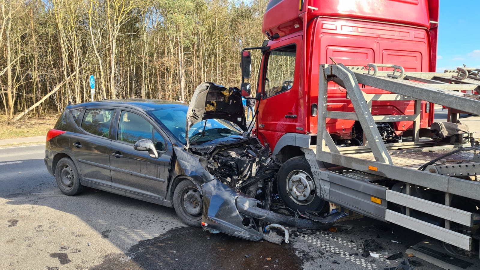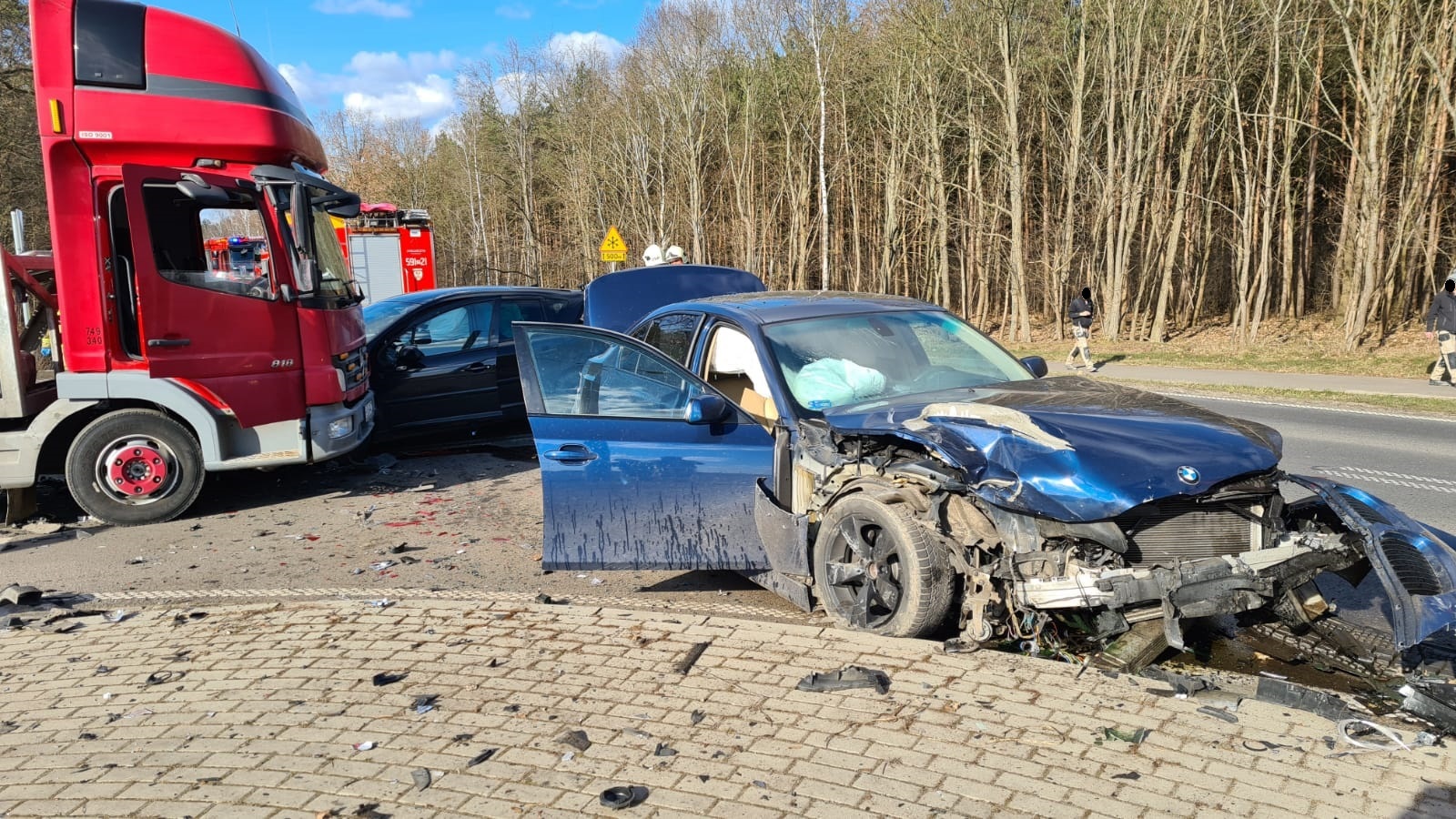Bardzo groźny wypadek na drodze wojewódzkiej. Dwa rozbite auta osobowe, uszkodzona ciężarówka