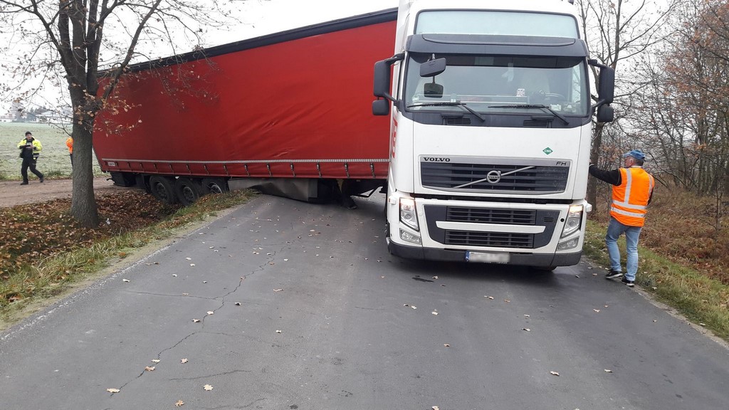 Pozostająca poza jezdnią część naczepy skutecznie unieruchomiła cały zestaw, powodując jednocześnie, że droga została w całości zablokowana.