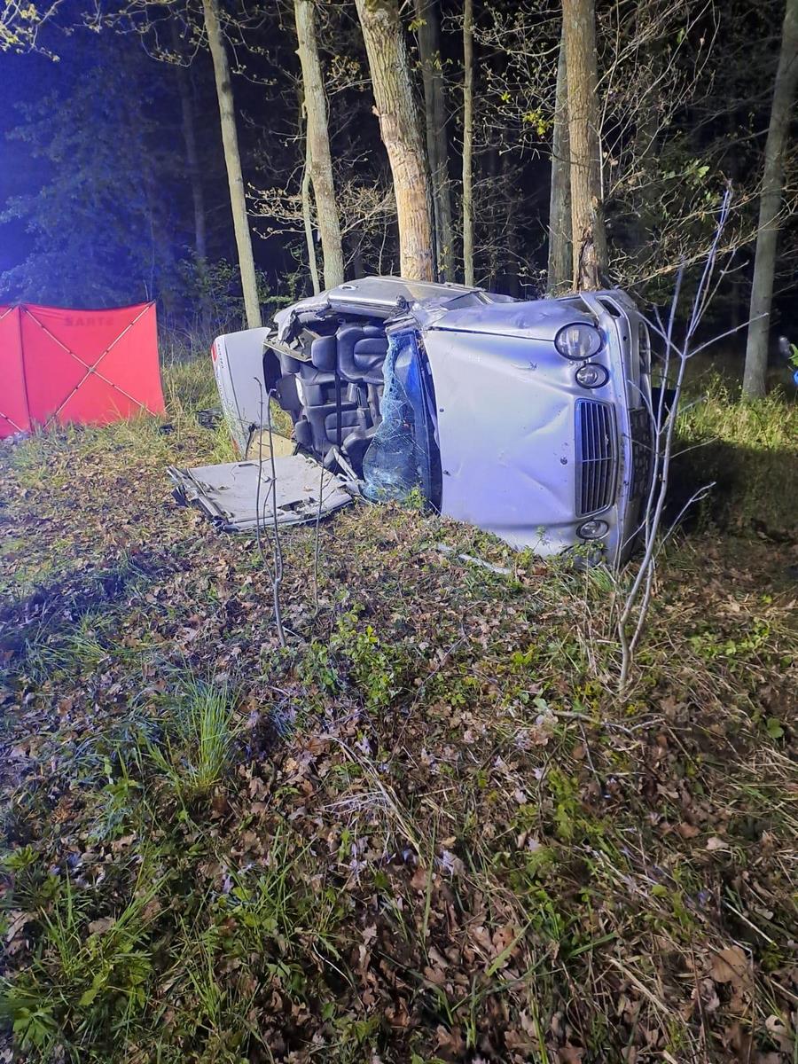Na miejsce zdarzenia zadysponowano jeden zastęp z Jednostki Ratowniczo-Gaśniczej w Gnieźnie oraz dwa zastępy z OSP w Niechanowie. Po przybyciu na miejsce zdarzenia pierwszego zastępu zastano samochód osobowy w pozycji na prawym boku. Samochód wypadł z drogi a następnie podwoziem uderzył w drzewo. Pojazdem podróżowały cztery osoby, trzy osoby opuściły pojazd o własnych siłach przed przybyciem służb ratunkowych, natomiast kierujący pojazdem znajdował się w aucie.