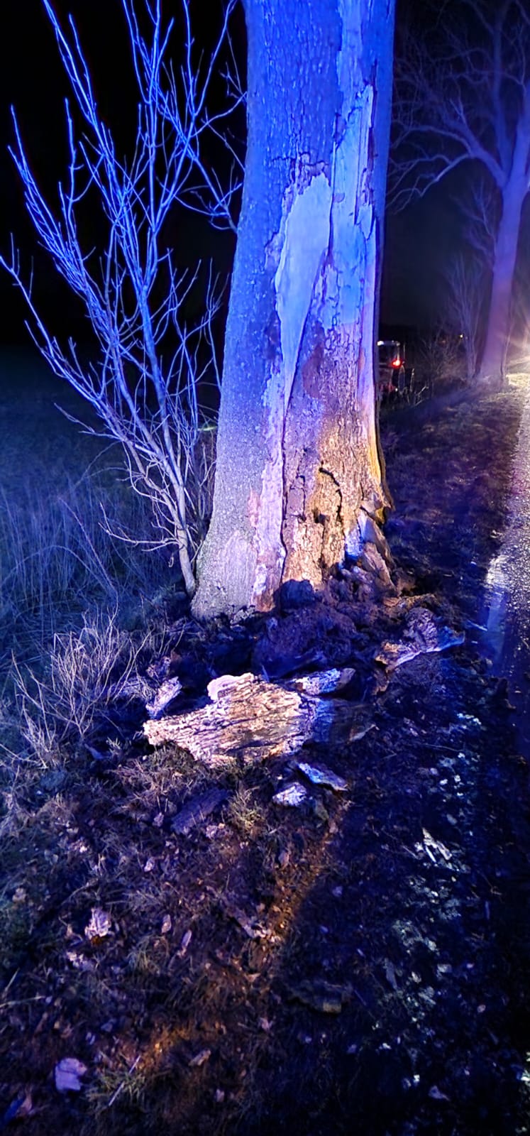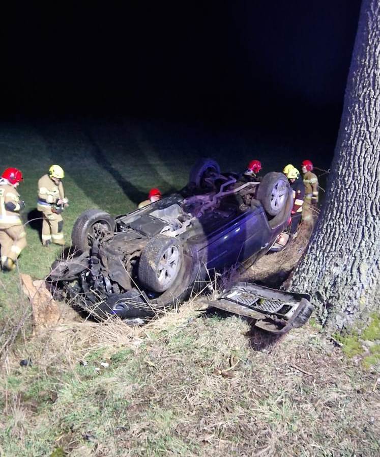 Po dojeździe na miejsce zdarzenia strażacy zastali samochód osobowy, który uderzył w drzewo, a następnie dachował. Kierujący opuścił pojazd przed przybyciem SP i oddalił się z miejsca zdarzenia. Pojazd znajdowała się na dachu na pobliskim polu.