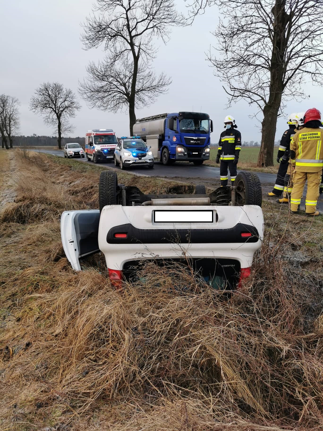 Podczas dojazdu we wskazaną lokalizację pierwszy zastęp pożarniczy ustalił, że do zdarzenia doszło na drodze pomiędzy Łagiewnikami a Starkówcem więc pozostałe zastępy po sprawdzeniu trasy wskazanej w zgłoszeniu dojechały do miejsca prowadzonych działań. Na miejscu w wyniku przeprowadzonego rozpoznania Kierujący Działaniem Ratowniczym ustalił, że samochód osobowy wypadł z drogi i znajdował się na dachu w rowie. Pojazdem podróżował jedna osoba i w momencie przybycia jednostek straży pożarnej znajdowała się poza pojazdem. Strażacy po zabezpieczeniu miejsca zdarzenia pomogli ratownikom medycznym w transporcie osoby poszkodowanej do karetki pogotowia, gdzie były prowadzone dalsze badania. Po przeprowadzeniu czynności dochodzeniowych przez Policję strażacy postawili pojazd na koła, zweryfikowali wycieki płynów technicznych oraz odłączyli akumulator. Ratownicy medyczni podjęli decyzje o zabraniu osoby poszkodowanej do szpitala.