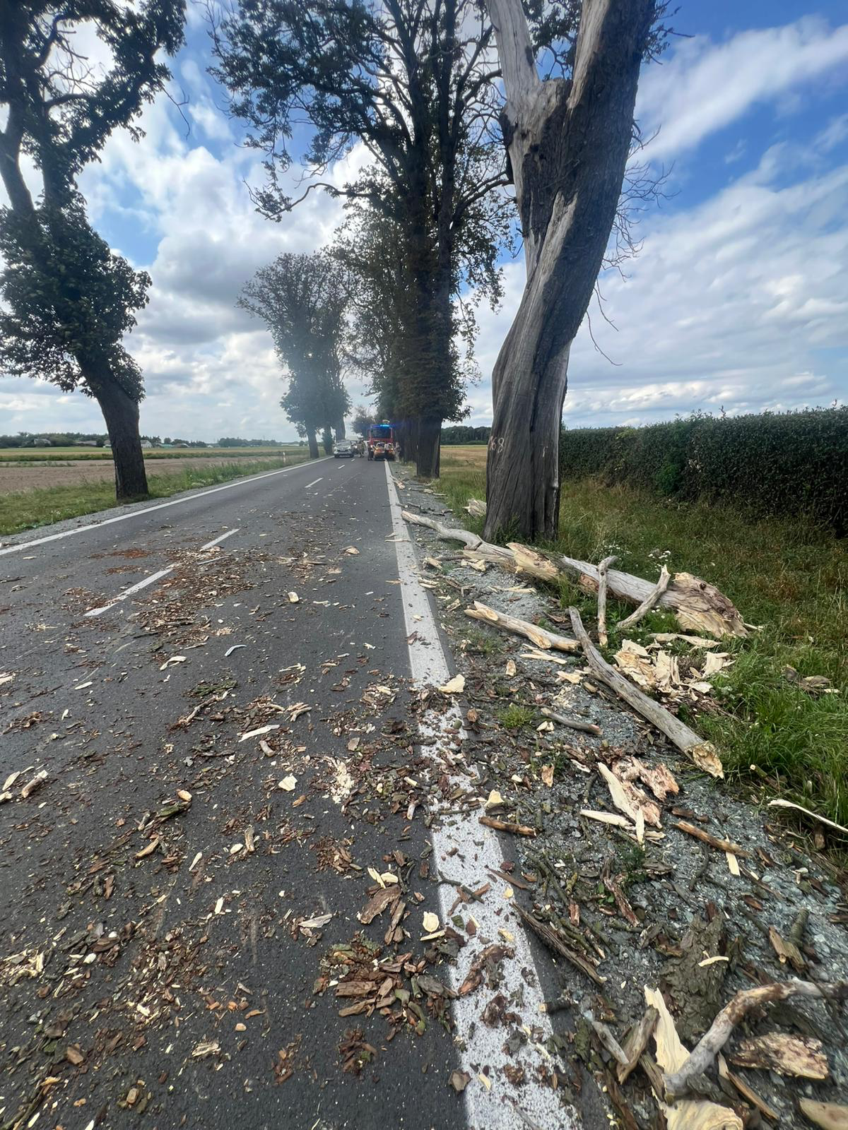 Kilkanaście minut później, w innej części gminy, także na DW190 w miejscowości Łaziska, tuż przed nadjeżdżający pojazd osobowy spadł odłamany konar drzewa. Kierowca nie był w stanie uniknąć kolizji i wjechał wprost na niego. W tym zdarzeniu straty także odnoszą się do kwestii materialnych. Kierujący pojazdem mężczyzna i podróżująca z nim pasażerka nie odnieśli obrażeń.