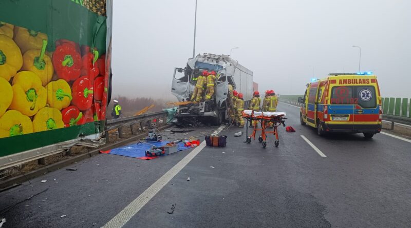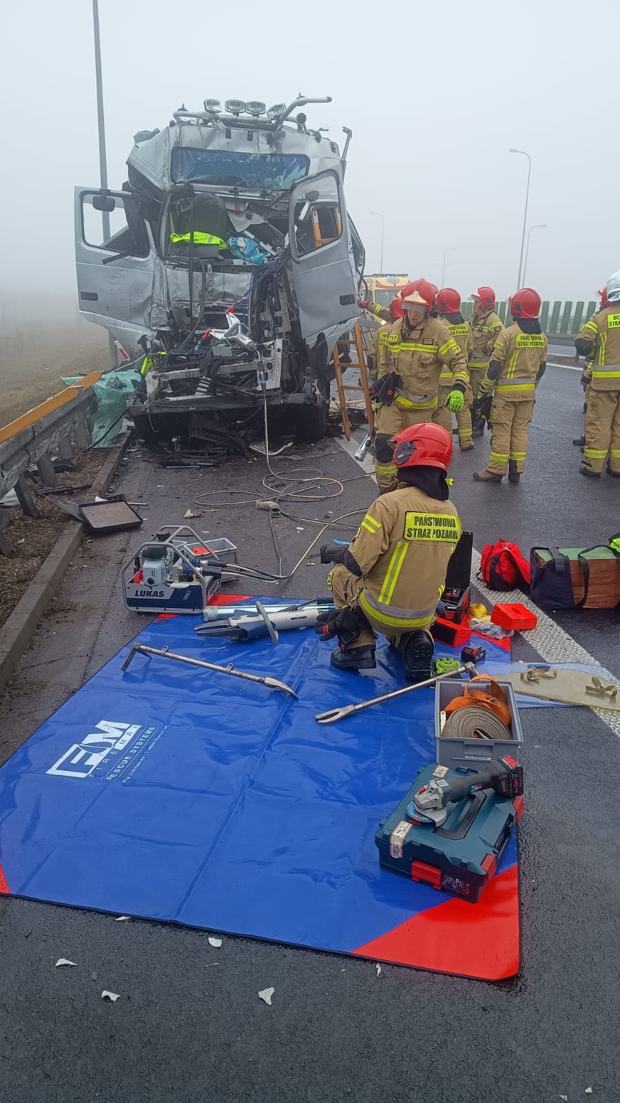 Na miejsce zdarzenia zadysponowano trzy zastępy z Jednostki Ratowniczo-Gaśniczej w Gnieźnie oraz jeden zastęp z OSP w Łubowie. Po przybyciu na miejsce zdarzenia i przeprowadzeniu rozpoznania ratowniczego okazało się, że doszło do dwóch kolizji (miejsca te oddalone były od siebie około 100m). W pierwszym zdarzeniu udział brały trzy samochody ciężarowe (w jednym z pojazdów znajdował się zakleszczony kierowca TIRa), natomiast druga kolizja (trzy samochody osobowe i jeden samochód ciężarowy) to efekt gwałtownego zwalniania innych kierowców, którzy zauważyli poprzedzający wypadek i chcieli wyhamować swoje auta doprowadzając w ten sposób do zderzenia. W jednym z pojazdów osobowych kierowca potrzebował pomocy medycznej, dlatego po przebadaniu strażacy i ratownicy medyczni ewakuowali poszkodowanego z pojazdu na noszach typu deska a następnie przetransportowano karetką do szpitala. Równolegle do tych działań strażacy przystąpili do uwalniania zakleszczonego kierowcy TIRa przy użyciu narzędzi hydraulicznych. Po wykonaniu dostępu został on również ewakuowany na zewnątrz pojazdu i przetransportowany drugą karetką do szpitala. Na czas prowadzonych działań droga została całkowicie zablokowana – Policja zorganizowała objazdy. Dokładne okoliczności zdarzenia ustala Policja.