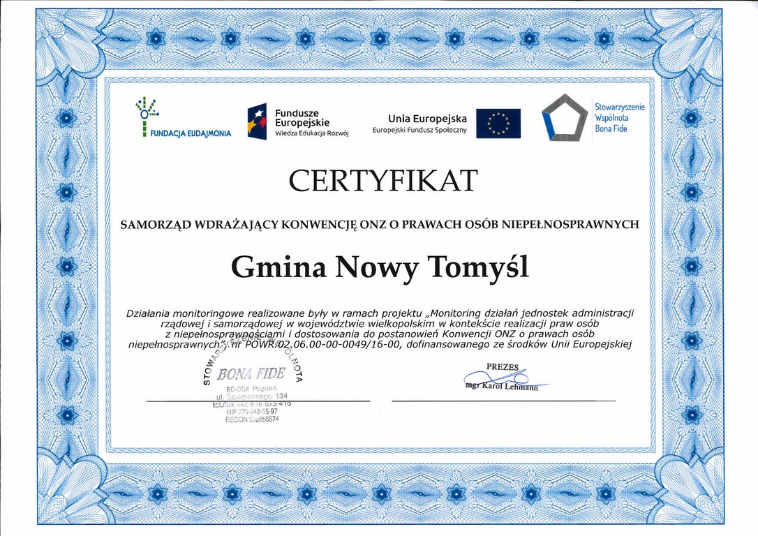 i samorządowej w województwie wielkopolskim w kontekście realizacji praw osób z niepełnosprawnościami i dostosowania do postanowień Konwencji ONZ o prawach osób niepełnosprawnych”, który realizowały Stowarzyszenie Wspólnota Bona Fide i Fundacja Eudajmonia. Niezależni eksperci prowadzili monitoring w Urzędzie Miejskim i w wybranych jednostkach organizacyjnych. Certyfikat potwierdza wdrożenie rozwiązań ułatwiających osobom z niepełnosprawnością funkcjonowanie w naszym środowisku.
