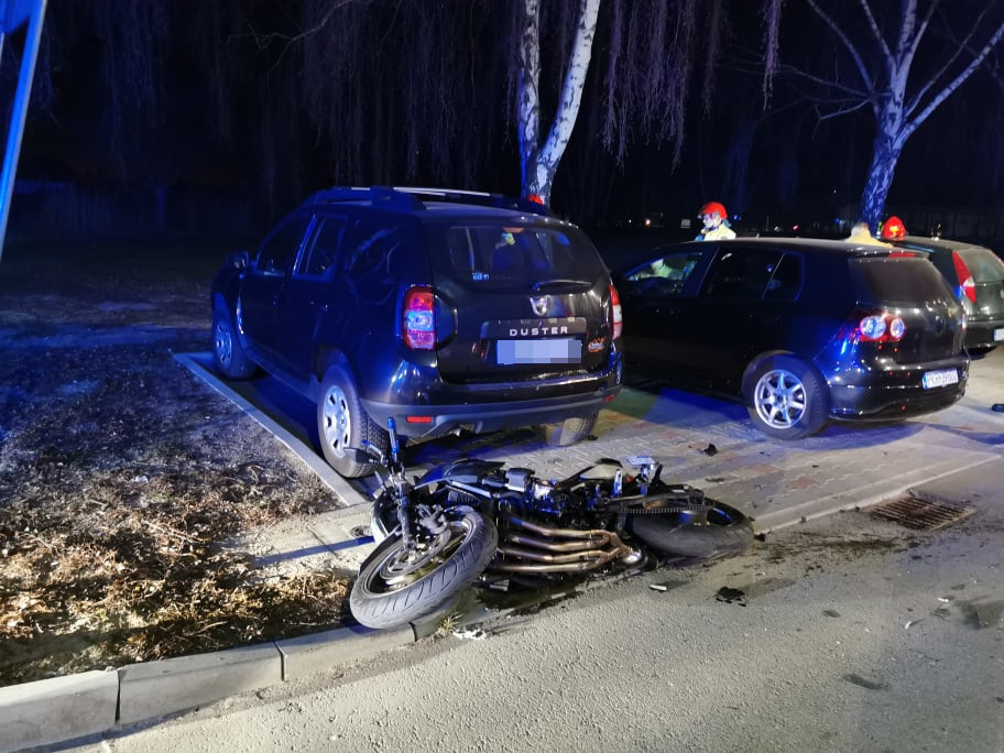 Do zdarzenia skierowano trzy zastępy z JRG w Krotoszynie oraz jeden zastęp z jednostki OSP Krotoszyn. Na miejscu ustalono, że doszło do zdarzenia z udziałem samochodu osobowego z motocyklem, którym przemieszczały się dwie osoby. Kierowca samochodu osobowego opuścił pojazd i nie uskarżał się na żadne dolegliwości. Natomiast dwoje podróżujących jednośladem z licznymi obrażeniami są przytomne. Uszkodzony samochód znajdował się poza obrysem jezdni, natomiast motocykl znajdował się na drodze. Strażacy zabezpieczyli miejsce zdarzenia i przystąpili do udzielania kwalifikowanej pierwszej pomocy uczestnikom zdarzenia. W międzyczasie na miejsce dotarła Policja oraz Zespół Ratownictwa Medycznego, który przejął opiekę nad poszkodowanymi osobami. Po dotarciu drugiego zespołu PRM oraz przebadaniu poszkodowanych kierownik zespołu podjął decyzję o przetransportowaniu obydwóch mężczyzn do Szpitalnego Oddziału Ratunkowego. W dalszej części działań w uszkodzonych środkach lokomocji odłączono akumulatory oraz zabezpieczono wycieki płynów eksploatacyjnych. Po zakończeniu czynności realizowanych przez funkcjonariuszy Policji z jezdni usunięto elementy karoserii oraz płyny eksploatacyjne stwarzające zagrożenie dla pojazdów kołowych. Na tym działania zakończono i zastępy wróciły do miejsca stacjonowania. Działania straży pożarnej trwały 1 godzinę i 36 minut.