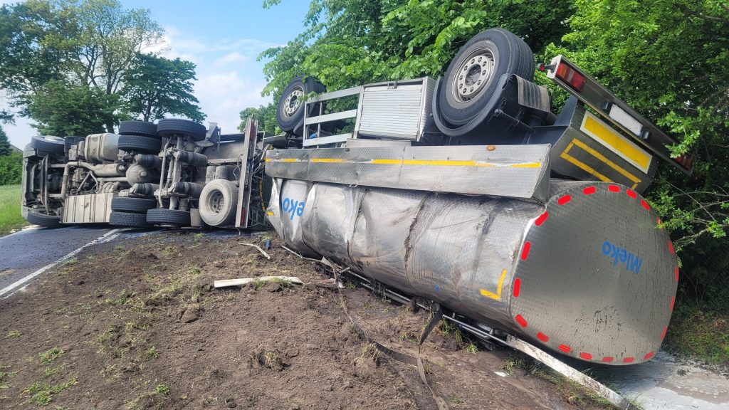 W wyniku wypadku uszkodzeniu uległ zbiornik, z którego wydostało się mleko do przydrożnego rowu oraz częściowo na jezdnię.
