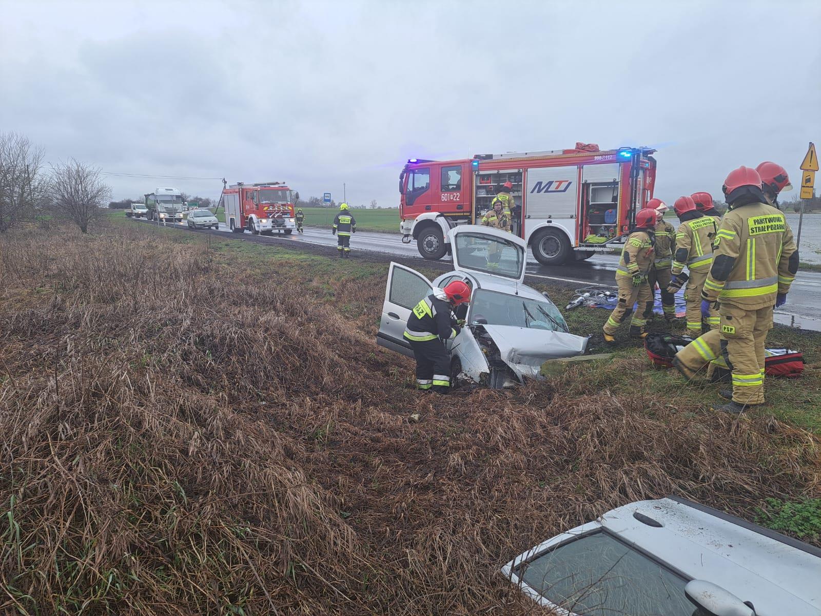 Pod wskazany adres niezwłocznie zadysponowano 2 zastępy z JRG Śrem oraz zastęp OSP Brodnica i OSP Manieczki. Po przybyciu na miejsce, w rozpoznaniu ustalono, że w zdarzeniu brał udział samochód osobowy, który znajdował się w przydrożnym rowie. Wskutek zdarzenia osoba poszkodowana została uwięziona we wraku pojazdu. Do zadań przybyłych na miejsce zastępów należało zabezpieczenie miejsce zdarzenia oraz uwolnienie kierowcy z wraku przy użyciu narzędzi hydraulicznych.