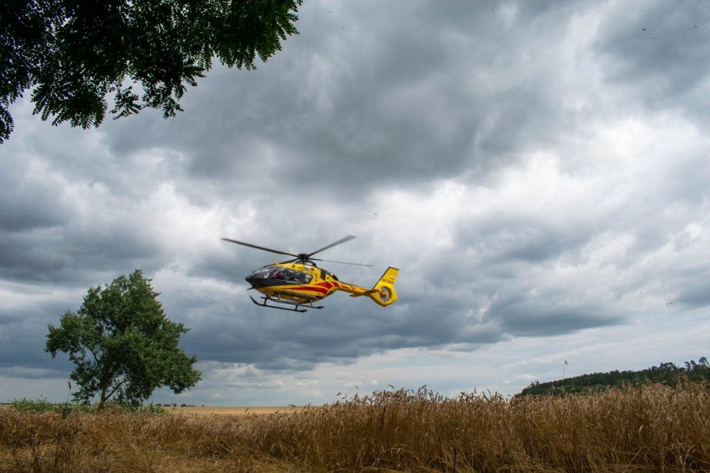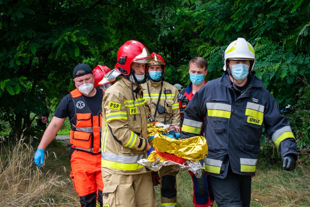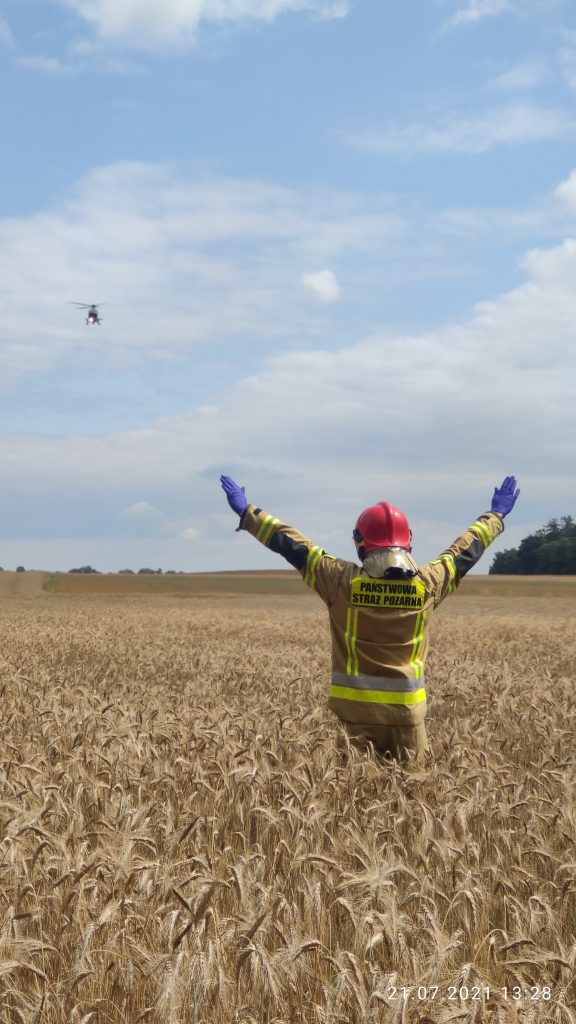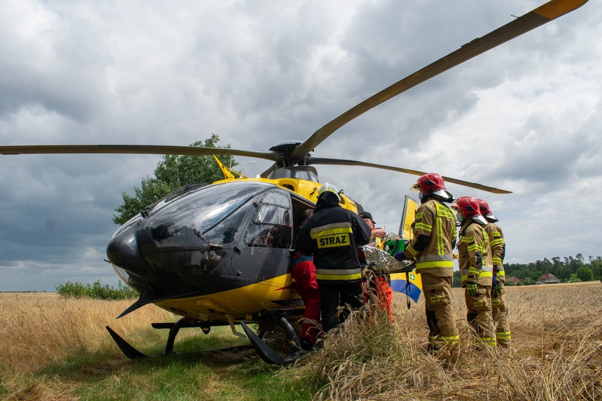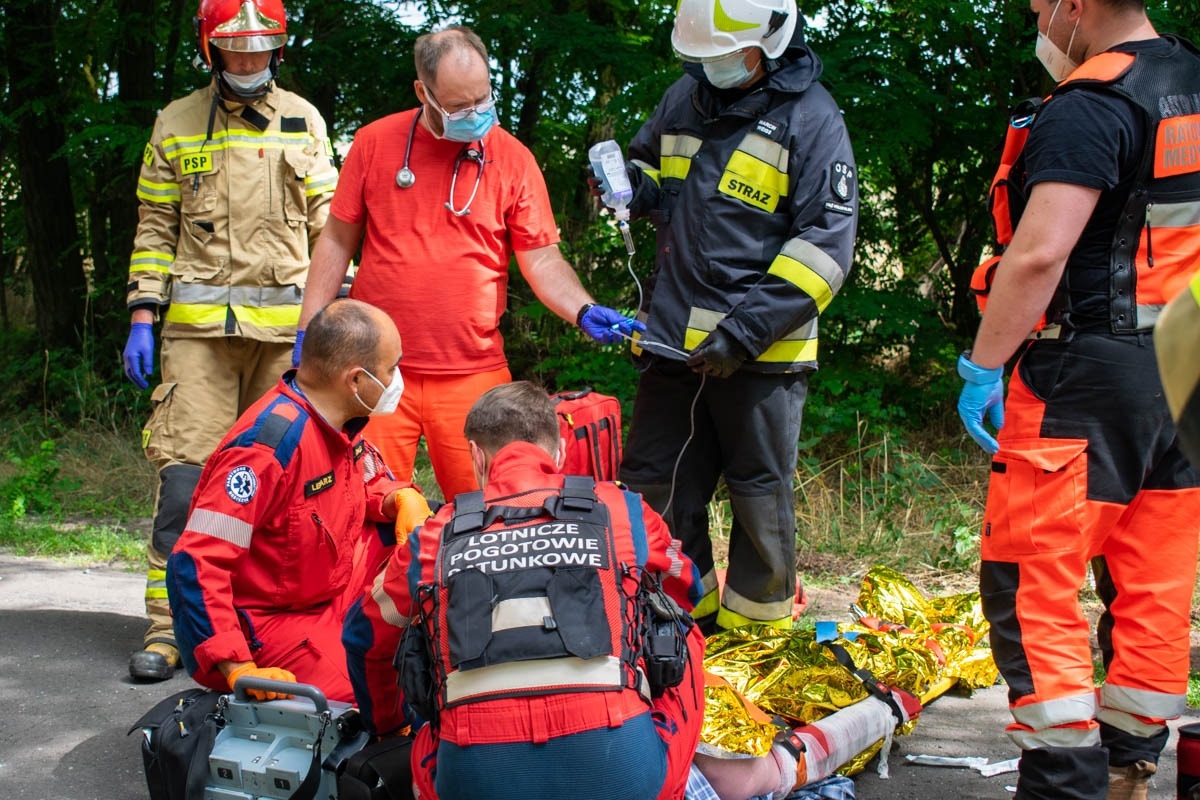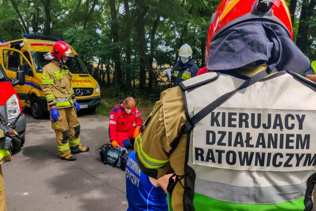 Strażacy natychmiast przystąpili do realizacji działań ratowniczych w postaci zabezpieczenia terenu akcji oraz udzielenia rannemu niezbędnej pomocy. W ramach wykonywanych czynności z zakresu kwalifikowanej pierwszej pomocy ratownicy ułożyli poszkodowanego mężczyznę na ziemi, wdrożyli postępowanie przeciwwstrząsowe, ustabilizowali szyjny odcinek kręgosłupa, zaopatrzyli obrażenia kończyn górnych, twarzy oraz nóg, jednocześnie przez cały czas prowadząc wsparcie psychiczne pacjenta. W momencie przybycia na miejsce działań Zespołu Ratownictwa Medycznego lekarz i ratownicy medyczni przejęli opiekę nad rannym. Na podstawie oględzin obrażeń poszkodowanego podjęto decyzję o wezwaniu na teren akcji śmigłowca Lotniczego Pogotowia Ratunkowego celem transportu pacjenta do szpitala. Mężczyzna został poddany zabiegom mającym na celu zabezpieczenie jego stan zdrowia podczas lotu śmigłowcem. Po wylądowaniu LPR osoba poszkodowana została ułożona na noszach i przetransportowana do śmigłowca. Ranny został zabrany do szpitala. Przez czas trwania działań miejsce akcji było zabezpieczane przez funkcjonariuszy Policji, którzy wyłączyli z ruchu ten odcinek drogi. Po zabraniu pacjenta policjanci przystąpili do prowadzenia czynności dochodzeniowych mających na celu ustalić przebieg i przyczynę zdarzenia. Po zbadaniu śladów przez funkcjonariuszy Policji obecni na miejscu strażacy zabezpieczyli rozlane płyny eksploatacyjne pojazdu przy użyciu sorbentu.