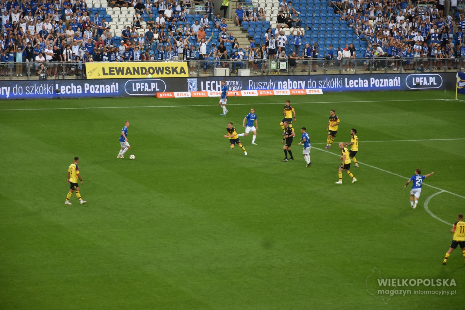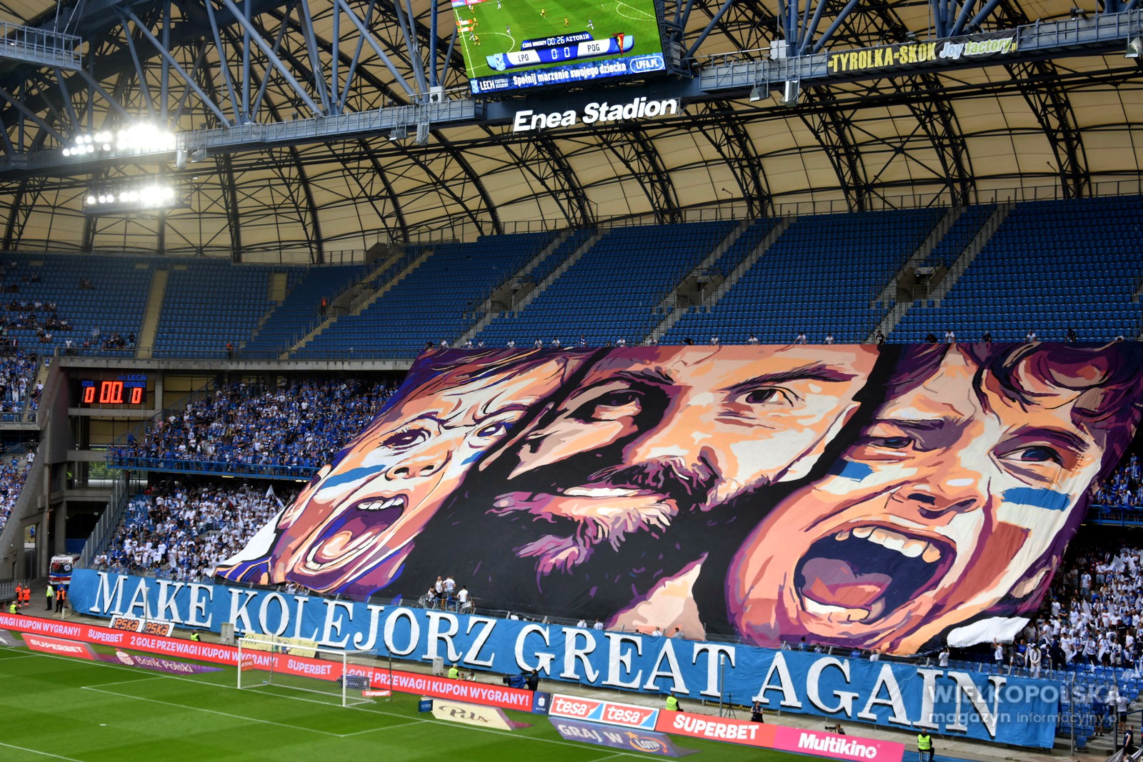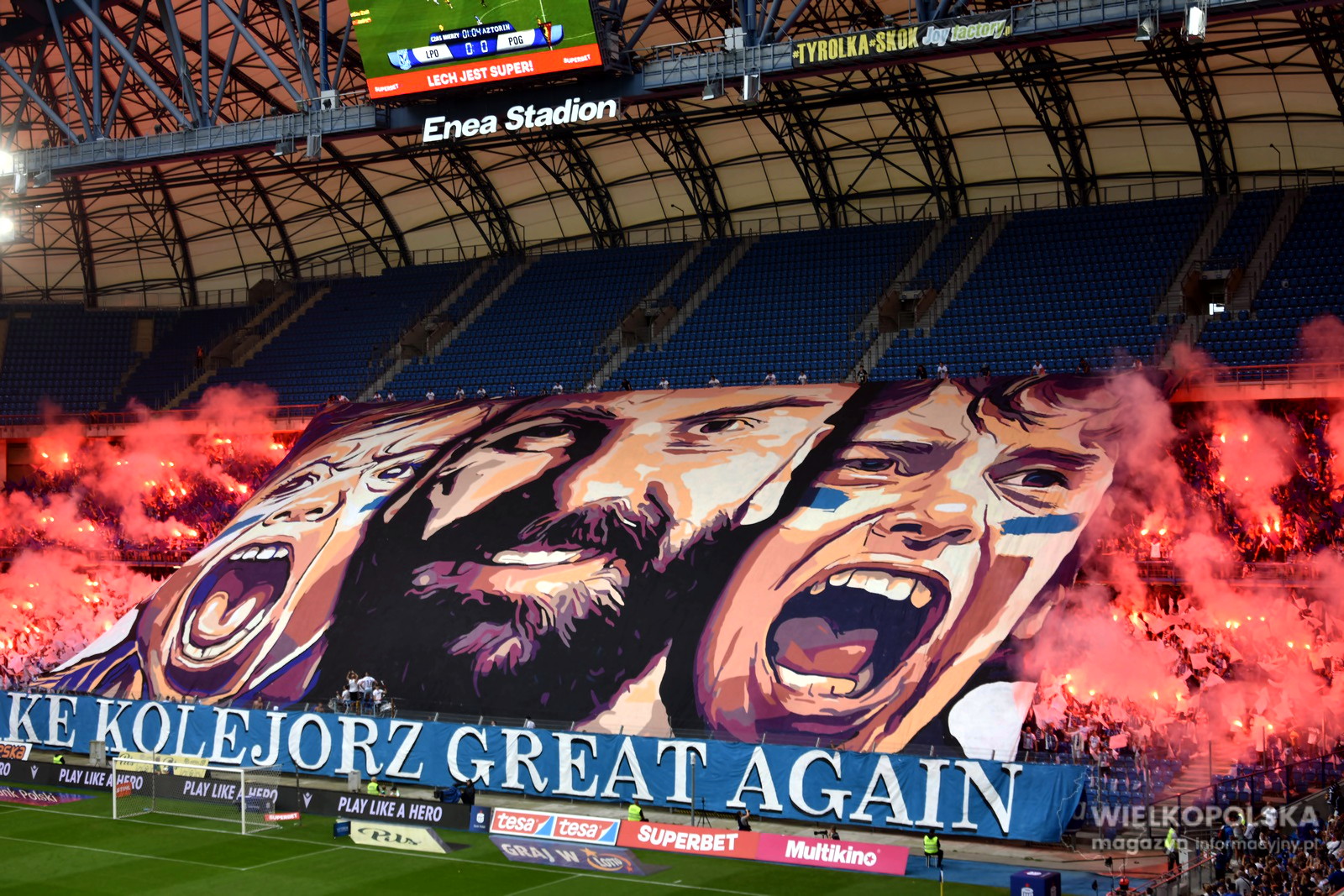 To było piękne popołudnie na Enea Stadionie przy Bułgarskiej. Pogoda dopisała, piękna gra Lecha, a to wszystko przy wsparciu publiczności na trybunach. Już przy wyjściu na boisko piłkarzy przywitała efektowna oprawa z napisem „Make Kolejorz great again”, a na wielkiej sektorówce znalazła się twarz naszego kapitana Mikaela Ishaka, a także dwóch fanów. Potem był kapitalny doping przez 90 minut, niósł on gospodarzy, którzy wygrali 2:0 po golach Afonso Sousy oraz Alego Gholizadeha.
