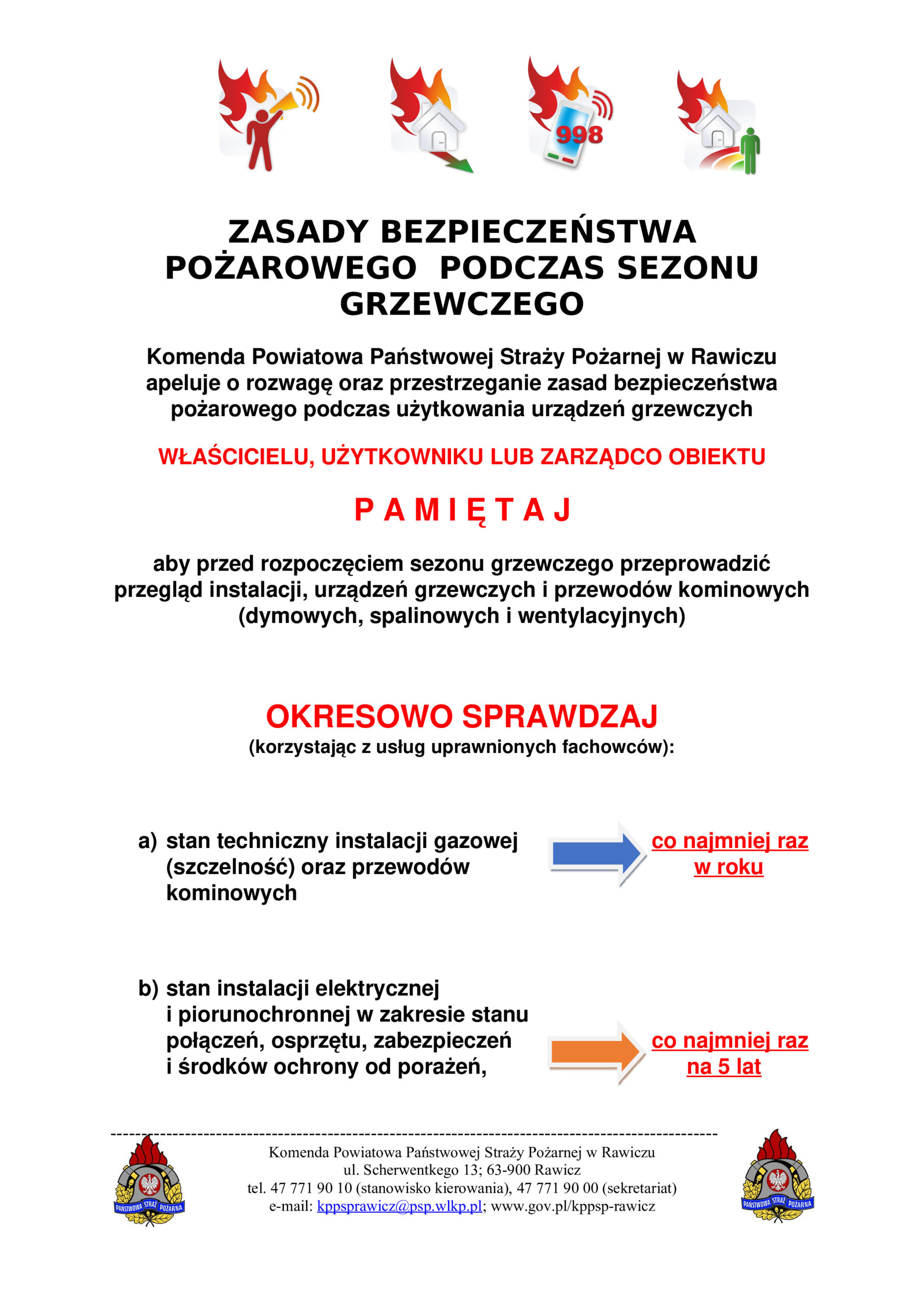 Prosimy o zapoznanie się z zamieszczoną poniżej ulotką, w której zawarte są najważniejsze zasady bezpieczeństwa pożarowego obowiązujące podczas sezonu grzewczego.