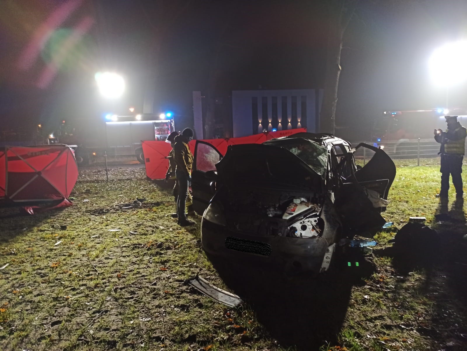 Ze wstępnych informacji wynikało, że dachował samochód osobowy, z którego prawdopodobnie wypadły dwie osoby. Po dotarciu na miejsce pierwszych zastępów stwierdzono, że kierujący samochodem osobowym marki Mercedes na prostym odcinku drogi prawdopodobnie stracił panowanie nad pojazdem, wypadł z drogi i po przejechaniu krótkiej odległości dachował uszkadzając przy tym ogrodzenie i infrastrukturę sportową boiska do piłki nożnej. Podróżujący samochodem dwoje mężczyzn w wieku 23 i 24 lat, mieszkańcy gminy Krzyż Wielkopolski, prawdopodobnie podczas dachowania wypadli z samochodu i znajdowali się niedaleko pojazdu. U jednego z poszkodowanych kierowca innego pojazdu nie biorącego udziału w zdarzeniu rozpoczął resuscytację krążeniowo-oddechową, którą kontynuowali strażacy aż do przekazania poszkodowanego Zespołowi Ratownictwa Medycznego. Kierownik Zespołu po zbadaniu podjął decyzję o odstąpieniu od medycznych czynności ratunkowych. Drugi z poszkodowanych z urazami wielonarządowymi został zabrany przez Zespół Ratownictwa Medycznego do Szpitala Specjalistycznego w Pile. Oprócz czynności medycznych działania zastępów straży pożarnej polegały na zabezpieczeniu i oświetleniu terenu akcji. Droga na czas działań była całkowicie zablokowana. W działaniach brały udział: zastępy Państwowej Straży Pożarnej z Trzcianki oraz Ochotniczych Straży Pożarnej z Kuźnicy Żelichowskiej i Krzyża Wielkopolskiego, dwa Zespoły Ratownictwa Medycznego, prokurator wraz z funkcjonariuszami Policji w Czarnkowie. Na miejsce przybył również Oficer w dyspozycji Komendanta Powiatowego PSP w Czarnkowie.