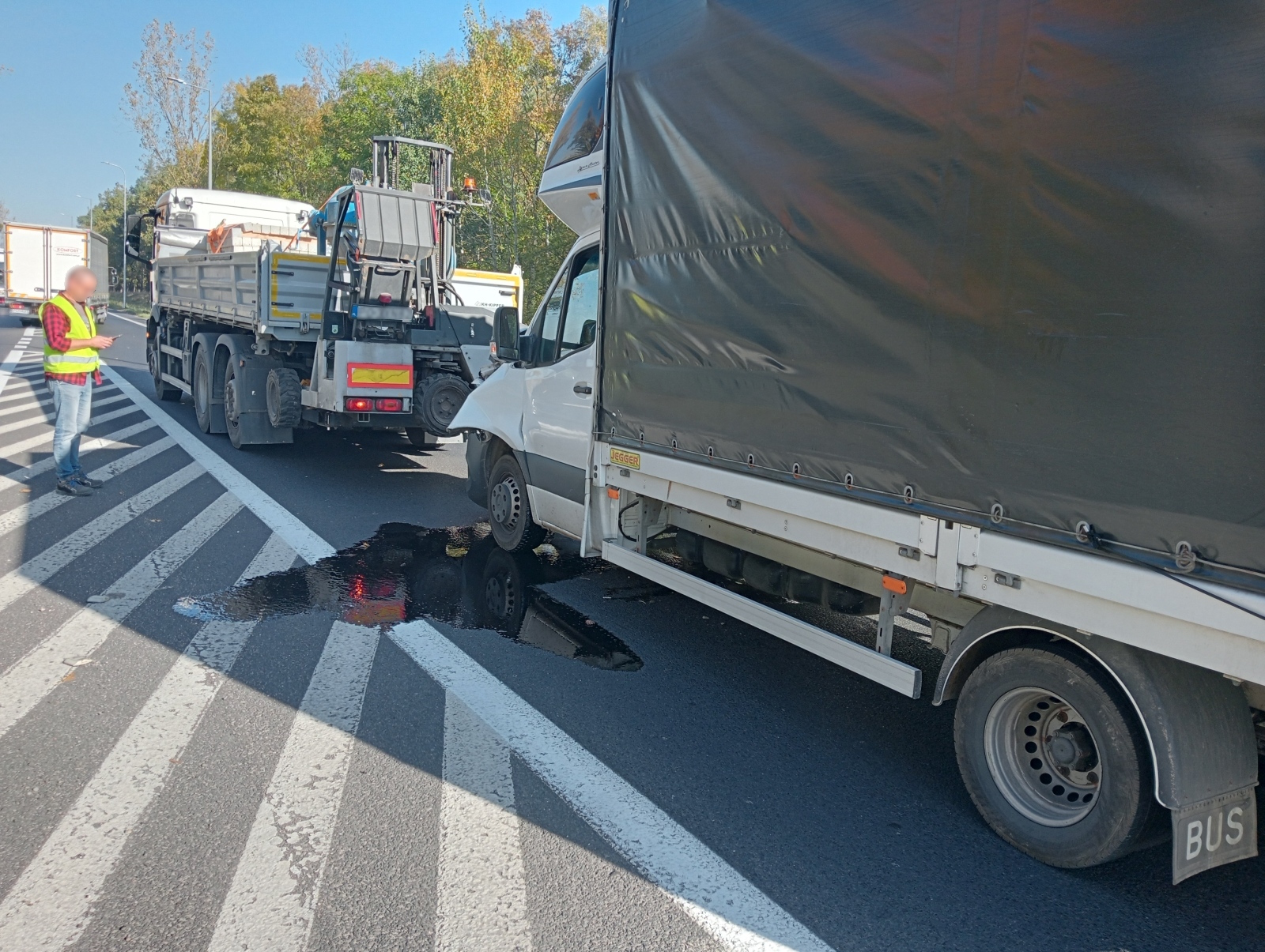 Żaden kierowca nie odniósł obrażeń i nie potrzebował pomocy medycznej. Ze wstępnych ustaleń stwierdzono, że kierowca busa nie wyhamował i uderzył w tył stojącego pojazdu ciężarowego. Z uwagi na duży wyciek oleju z samochodu dostawczego, na miejsce wezwano policję i straż pożarną. Inspektorzy do czasu usunięcia pojazdów z drogi oraz zakończenia działań strażaków kierowali ruchem. Utrudnienia na drodze trwały dwie godziny.