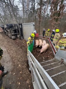 13 lutego 2025 r. tuż po godzinie 14 do Stanowiska Kierowania Komendanta Powiatowego Państwowej Straży Pożarnej w Gnieźnie wpłynęła informacja o kolizji samochodu ciężarowego przewożącego trzodę chlewną. Na miejsce zdarzenia zadysponowano jeden zastęp z Jednostki Ratowniczo-Gaśniczej w Gnieźnie oraz po jednym zastępie z OSP w Kiszkowie oraz OSP w Kłecku.