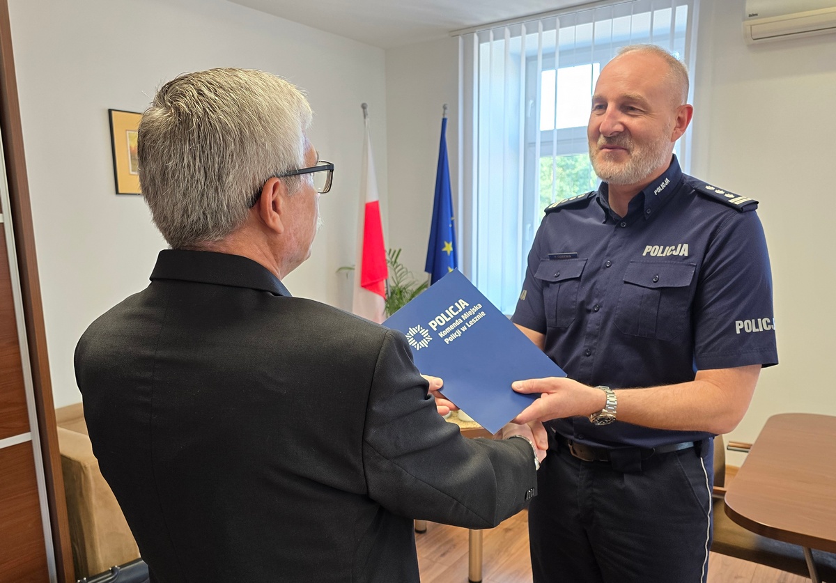 We wtorek, 9 lipca br. Komendant Miejski Policji w Lesznie insp. Piotr Gorynia spotkał się z bohaterami zatrzymania 32-latka. Pogratulował małżeństwu osobistego zaangażowana, odwagi, solidarności i konsekwencji w zatrzymaniu sprawcy usiłowania oszustwa. Swoją postawą para udowodniła, że policjantem jest się nieustannie, nawet po przejściu na emeryturę.