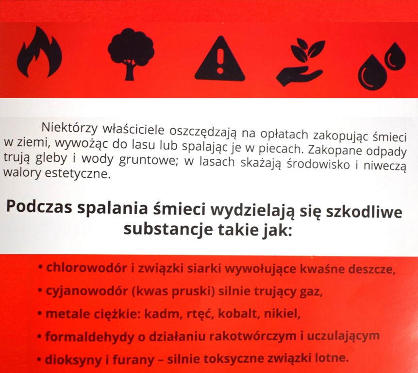Równocześnie powinniśmy pamiętać o tym, że tego typu działanie powoduje emisję do atmosfery szkodliwych substancji, które mają bezpośredni, negatywny wpływ zarówno na środowisko, jak i na zdrowie ludzi. Dym zawiera m.in. dwutlenek siarki, chlorowodór, cyjanowodór, a także rakotwórcze związki zwane dioksynami i furanami. Spalając odpady w ogniskach trujemy siebie, sąsiadów, powietrze, wodę i glebę.