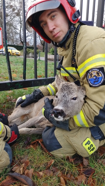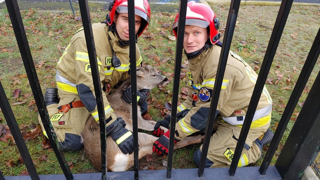 Zastęp z Jednostki Ratowniczo-Gaśniczej nr 1 został zadysponowany do nietypowego zdarzenia. Po przybyciu na miejsce okazało się, że pomocy potrzebuje sarna, która utknęła w metalowym ogrodzeniu.