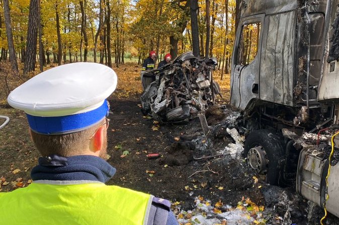 – Policjanci ścigali samochód, w którym poruszali się sprawcy napadu na kobietę, do którego doszło niedługo przedtem w Śremie. W pewnym momencie na łuku drogi zaczęli wyprzedzać kolumnę samochodów, uderzyli czołowo w jadący z naprzeciwka samochód peugeot, a następnie odbili się od tego auta i wpadli pod ciągnik siodłowy z naczepą. W wyniku tego zdarzenia samochód stanął w płomieniach – powiedział rzecznik wielkopolskiej policji mł. insp. Andrzej Borowiak.