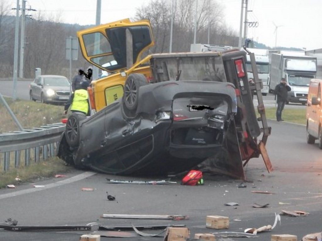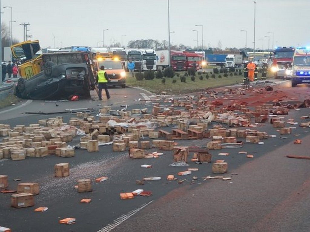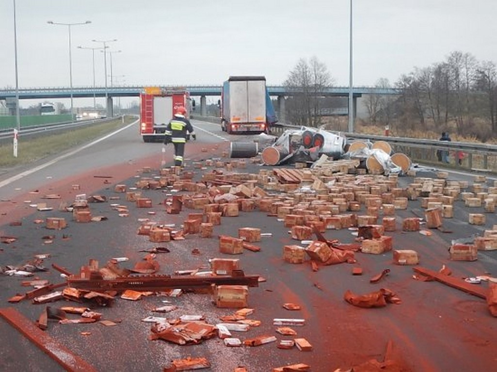 Bardzo niebezpieczny wypadek na autostradzie A 2. Zderzenie ciężarówki DAF z samochodem marki IVECO, który przewoził auto osobowe. Na jezdni beczki z surowcami budowlanymi
