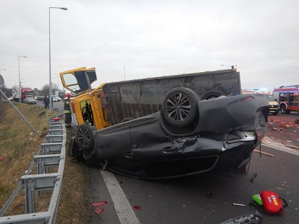 Dyżurny do działań zadysponował cztery zastępy JRG Koło, zastępy OSP Ruszków Pierwszy i OSP Trzęśniew oraz Specjalistyczną Grupę Ratownictwa Chemicznego-Ekologicznego z JRG nr 1 w Koninie. Po przybyciu na miejsce zdarzenia strażacy zabezpieczyli teren prowadzonych działań. W wyniku rozpoznania kierujący działaniem ratowniczym ustalił, że doszło do zdarzenia samochodu ciężarowego DAF z samochodem marki IVECO, który przewoził samochód osobowy. Z uszkodzonego samochodu ciężarowego na jezdnię wysypały się beczki z surowcami wykorzystanymi w przemyśle budowlanym, ruch na autostradzie w kierunku Warszawy został wstrzymany. Działania straży pożarnej polegały na udzieleniu kwalifikowanej pierwszej pomocy pasażerce IVEKO oraz sprawdzeniu rozsypanych granulatów pod kątem palności oraz rozpuszczalności w wodzie – ustalono, że substancje są obojętnie chemicznie. Dochodzenie w sprawie przyczyny wypadku prowadzi Policja. Łączny czas trwania akcji: 2 godziny 43 minuty. W działaniach udział brało 29 strażaków.