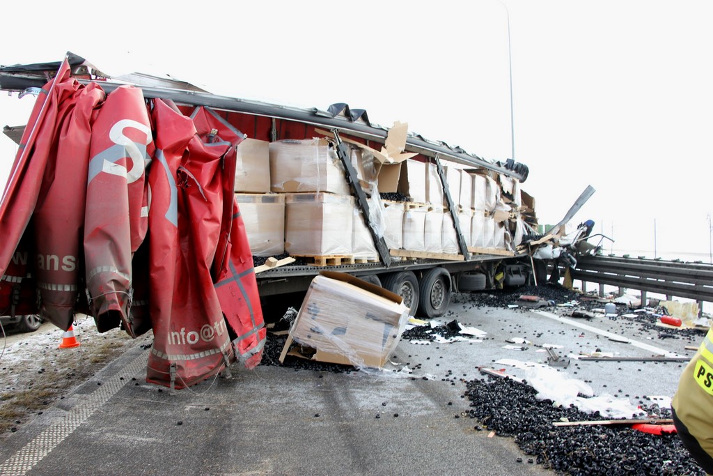 Pierwszy przybyły na miejsce zdarzenia zastał dwa samochody ciężarowe po zderzeniu, blokujące przejazd drogą S5 w kierunku Wrocławia oraz dwa samochody osobowe, które zostały uszkodzone przez odłamki spadające z naczep podczas zderzenia. Jeden z kierowców ciężarówki pozostawał zakleszczony w kabinie pojazdu, natomiast pozostali trzej kierowcy znajdowali się poza pojazdami na poboczu drogi. Jeden z samochodów ciężarowych przewoził plastikowe elementy przypominające nakrętki, natomiast w drugim znajdowały się zbiorniki typu MAUSER z klejem wykorzystywanym przy produkcji mebli. W wyniku zdarzenia doszło do rozszczelnienia jednego ze zbiorników i wycieku kleju na powierzchnię jezdni. Po zabezpieczeniu miejsca zdarzenia, wykonano dostęp do zakleszczonej osoby przy pomocy narzędzi hydraulicznych. Poszkodowanego przytomnego przekazano Zespołowi Ratownictwa Medycznego. Dodatkowo rozłączono akumulatory w uszkodzonych pojazdach. Ruch w kierunku poznania został częściowo udrożniony przez wykorzystanie pasa awaryjnego. Po wykonaniu czynności dochodzeniowych przez Policję częściowo usunięto plamę kleju z jezdni oraz rozsypane resztki powypadkowe. W wyniku zdarzenia całkowitemu zniszczeniu uległ samochód ciężarowy marki DAF XF z naczepą, natomiast druga naczepa oraz samochody osobowe marki Fiat Bravo i KIA Cee’d zostały uszkodzone. Stary zostały oszacowane na wartość 350 tys. zł.
