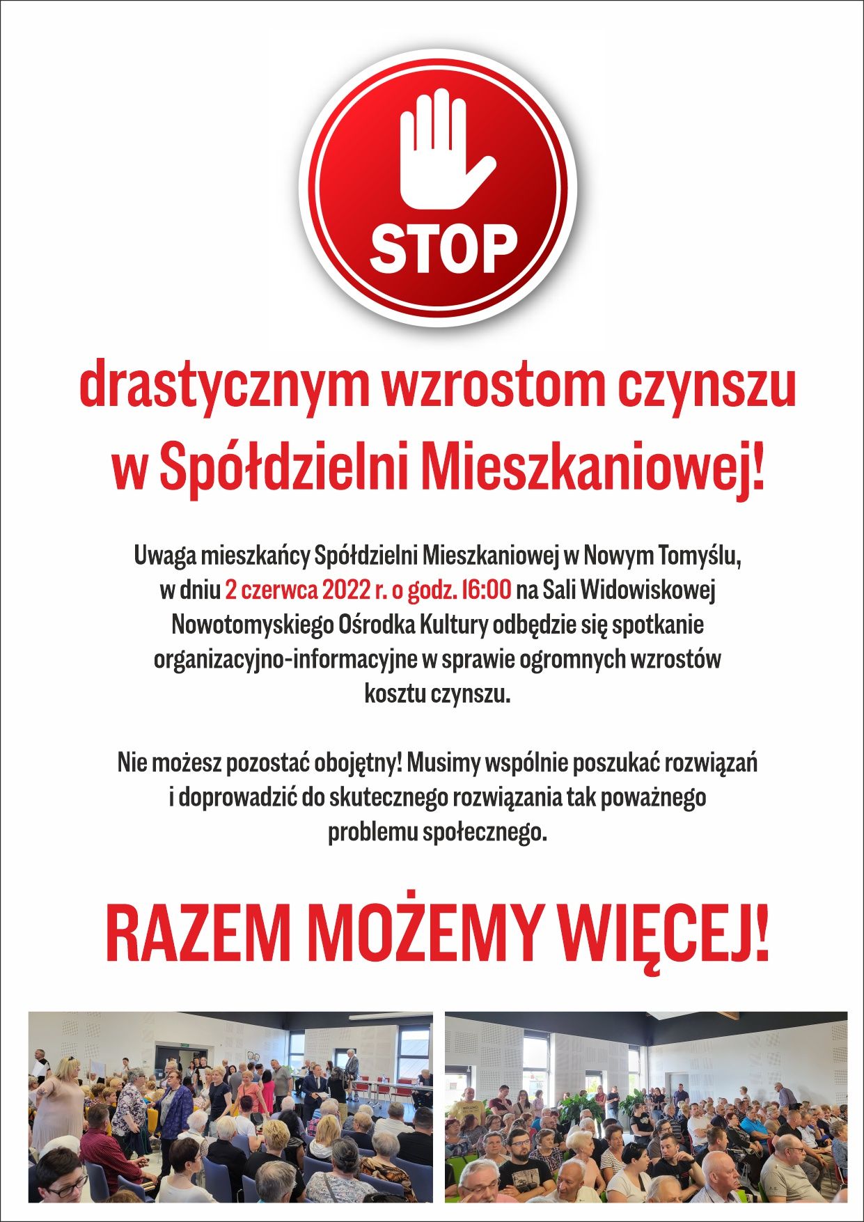 Uwaga mieszkańcy Spółdzielni Mieszkaniowej w Nowym Tomyślu, w dniu 2 czerwca 2022r. o godz. 16.00 na Sali Widowiskowej Nowotomyskiego Ośrodka Kultury odbędzie się spotkanie organizacyjno-informacyjne w sprawie ogromnych wzrostów kosztu czynszu.