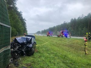 Dyżurny SKKP do działań zadysponował dwa zastępy ratownictwa technicznego i samochód rozpoznawczo-ratowniczy z JRG Nowy Tomyśl oraz jednostkę OSP Bolewice. Po przybyciu zastępów straży pożarnych na miejsce zdarzenia zastano samochód osobowy na pasie zieleni, wbity w ścianę bariery dźwiękochłonnej. Dwie osoby podróżujące pojazdem znajdowały się w radiowozie Policji. Działania strażaków polegały na zabezpieczeniu miejsca zdarzenia, udzieleniu kwalifikowanej pierwszej pomocy poszkodowanym (kontrola ABC, wsparcie psychiczne, opatrzenie ran), odciągnięciu uszkodzonego samochodu przy pomocy wyciągarki od bariery dźwiękochłonnej celem sprawdzenia ewentualnych wycieków substancji palnych oraz odłączeniu akumulatora w pojeździe. Poszkodowanych przekazano przybyłemu Zespołowi Ratownictwa Medycznego. Po przeprowadzonych badaniach, jedna osoba odmówiła transportu do szpitala, druga natomiast nie wymagała hospitalizacji.