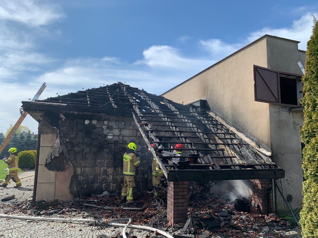 Dyżurny SKKP do działań zadysponował zastępy gaśnicze i drabinę mechaniczną SD-30 z Jednostki Ratowniczo Gaśniczej w Nowym Tomyślu oraz zastępy z jednostek Ochotniczej Straży Pożarnej z Borui Kościelnej, Wytomyśla. Po przybyciu strażaków na miejsce zdarzenia zastano palący się budynek gospodarczy z wiatą, zagospodarowany na garaż, biuro i spiżarnię, przylegający bezpośrednio do budynku gospodarczo – garażowego na sąsiedniej działce. Pożar zagrażał sąsiednim zabudowaniom. Działania straży pożarnej polegały w pierwszej fazie na zabezpieczeniu miejsca zdarzenia oraz podaniu 1 prądu gaśniczego w natarciu do płonącego budynku oraz 1 prądu wody w obronie na zagrożony sąsiedni budynek. Dalsze działania polegały na usunięciu tlących się materiałów z budynku i dogaszeniu ich na zewnątrz, oddymieniu obiektu przy pomocy agregatu oddymiającego oraz rozebraniu poszycia dachowego. Pogorzelisko przeszukano i sprawdzono kilkukrotnie kamerą termowizyjną. Spaleniu uległa konstrukcja dachu, wyposażenie pomieszczeń. Działaniami dowodził Zastępca Komendanta Powiatowego PSP w Nowym Tomyślu. Dochodzenie w sprawie ustalenia przyczyny i okoliczności powstania pożaru prowadzi Policja.