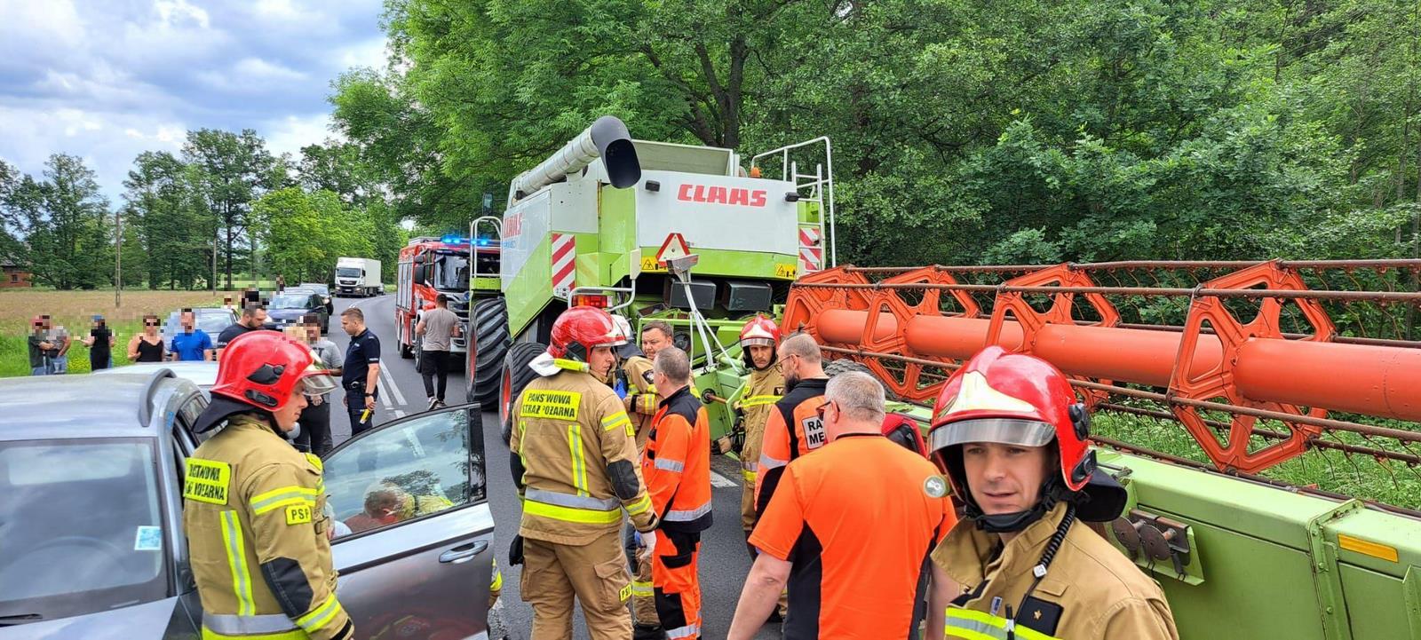 Po przybyciu zastępów na miejsce zdarzenia zastano dwa samochody osobowe na jednym pasie ruchu po widocznym zderzeniu oraz na drugim pasie jezdni kombajn marki zbożowy z przyczepą – na której ciągnięty był heder. Przyczepa miała oberwane koło, które znajdowało się ono na poboczu po drugiej stronie jezdni.