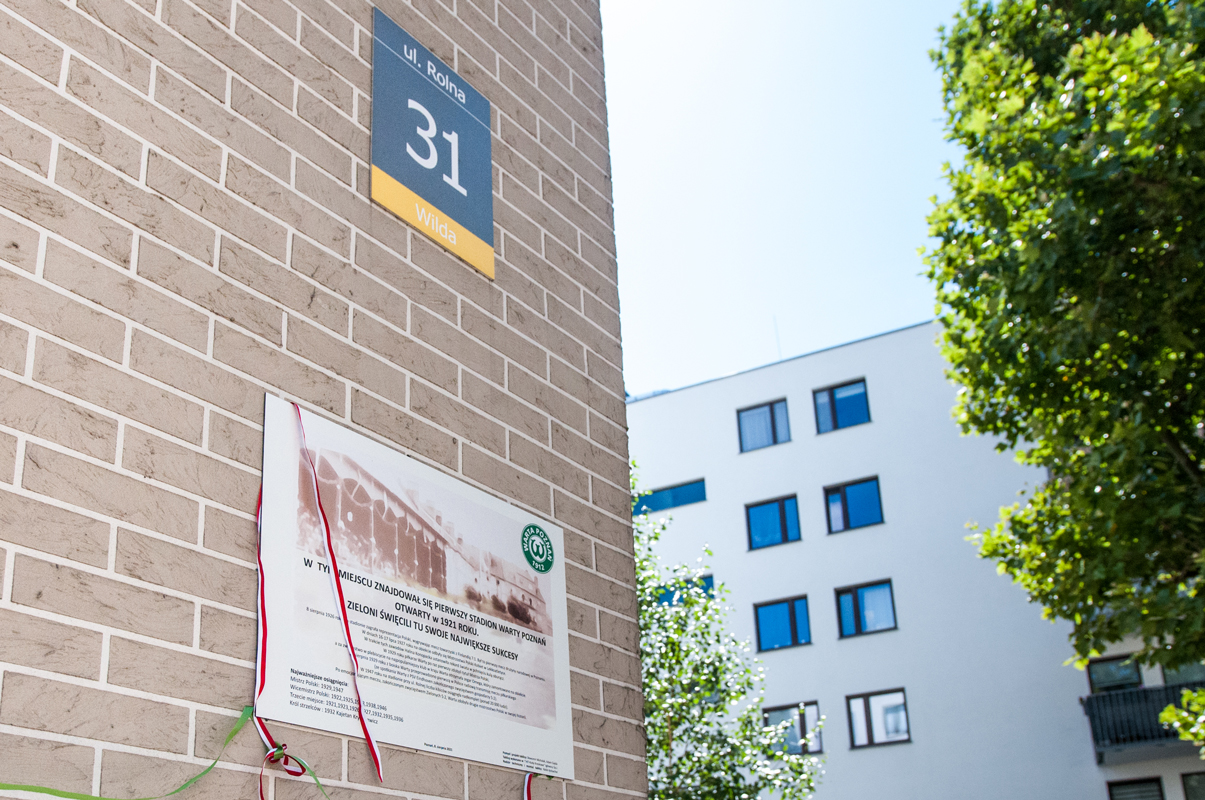 Dziś nie ma już śladu po stadionie, który służył Warcie Poznań przez ponad pół wieku – od 1921 roku do drugiej połowy lat 70. W miejscu dawnego boiska jest parking, bloki i właśnie na ścianie jednego z tych budynków zawisła tablica z herbem Warty Poznań, grafiką przedstawiającą drewnianą trybunę stadionu oraz garść informacji na temat historycznego obiektu.