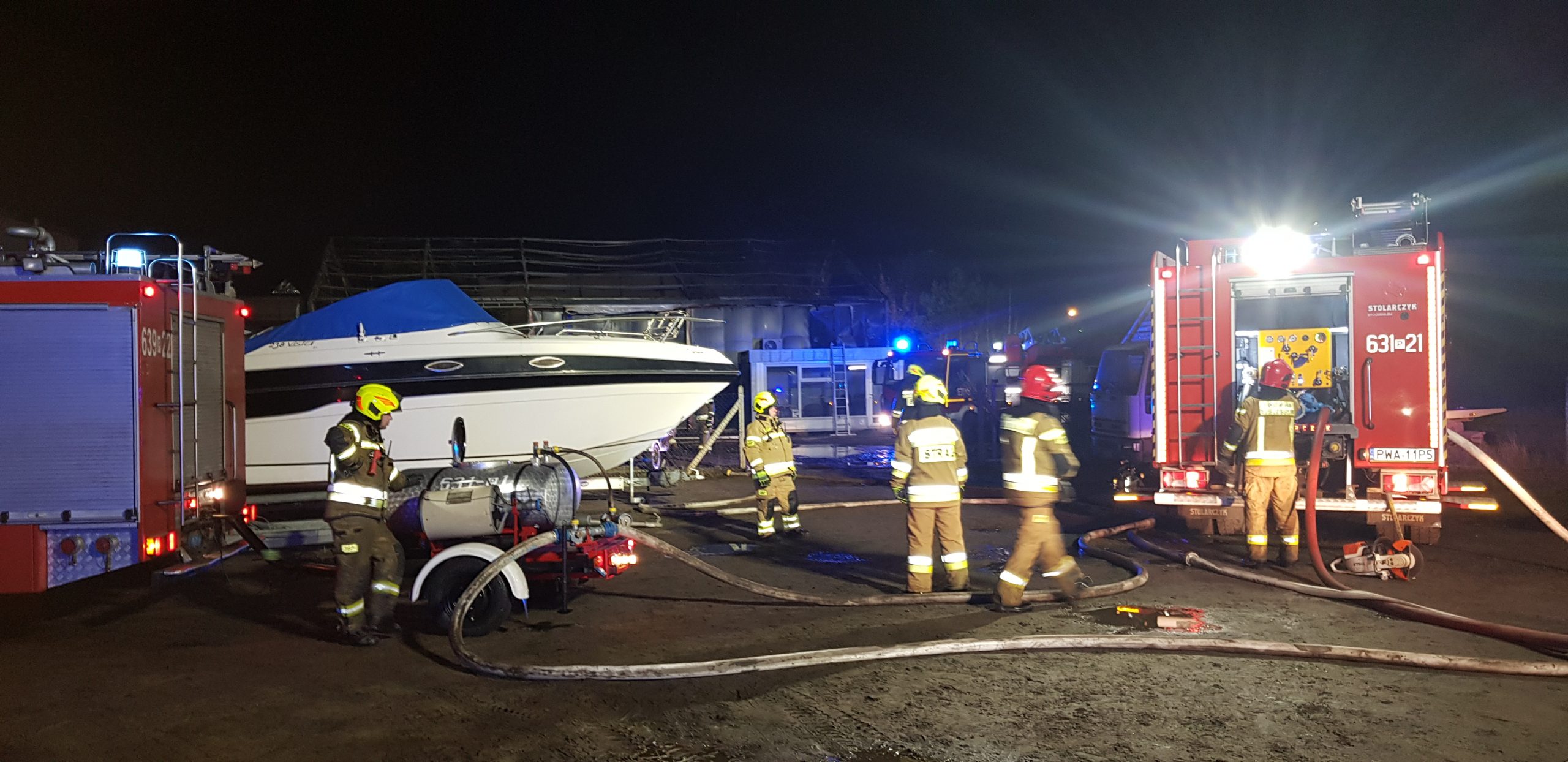 Działania straży pożarnej polegały na zabezpieczeniu i oświetleniu miejsca zdarzenia. Strażacy w pierwszej fazie działań gaśniczych podali jeden prąd wody w obronie przylegającej hali oraz jeden prąd wody na palącą się halę. W czasie rozpoczętych działań gaśniczych strażakom udało się ewakuować z hali obok 3 łodzie motorowodne.