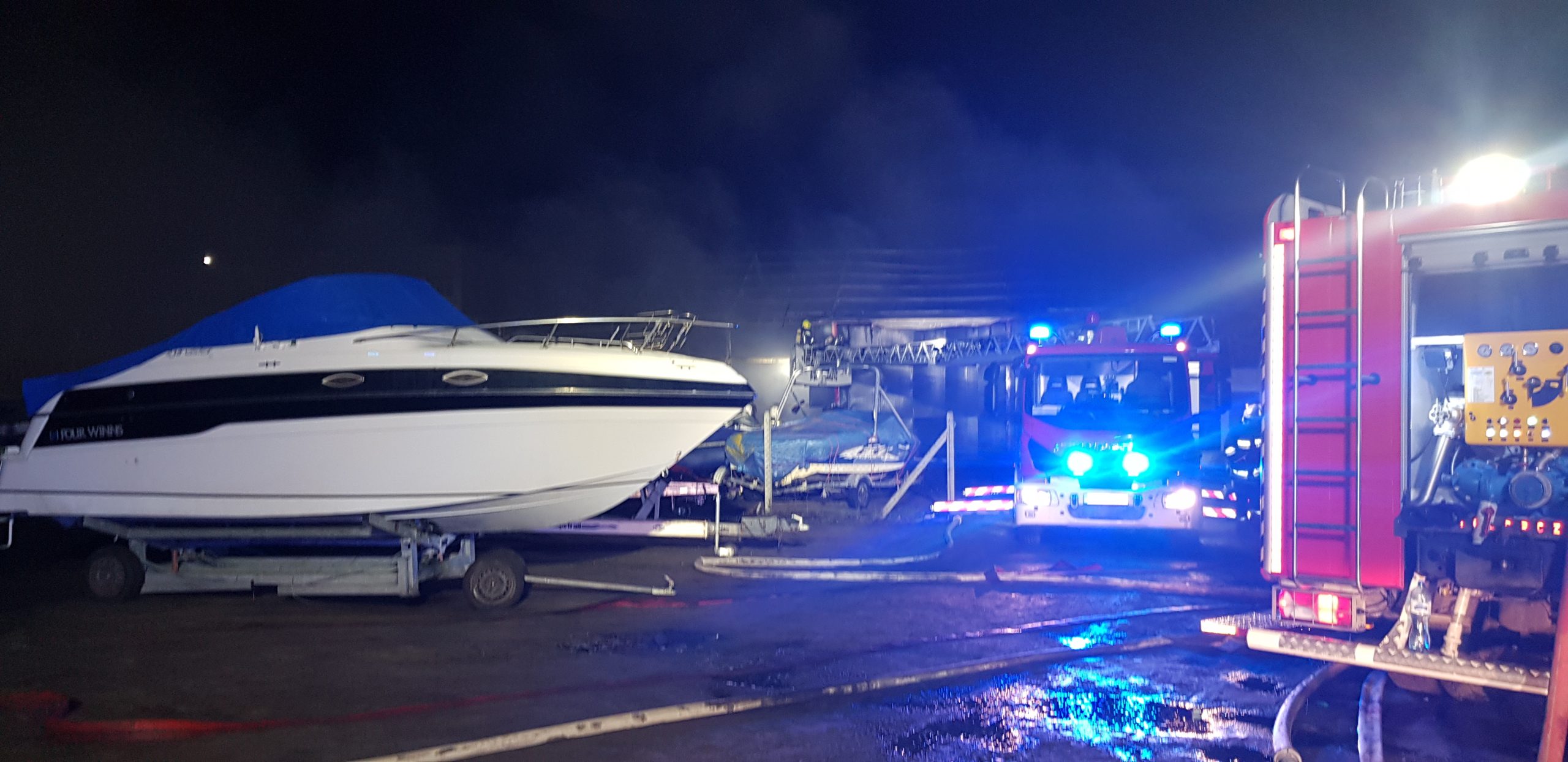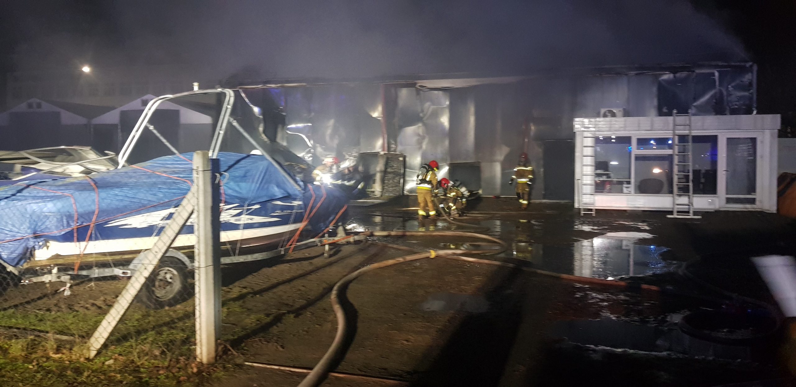 Po dojeździe na miejsce pożaru okazało się, że pali się hala, w której przechowywane są jachty oraz łodzie pływające. Przebywający na miejscu właściciel poinformował Kierującego Działaniami Ratowniczymi, że wewnątrz płonącego obiektu nie ma osób trzecich.