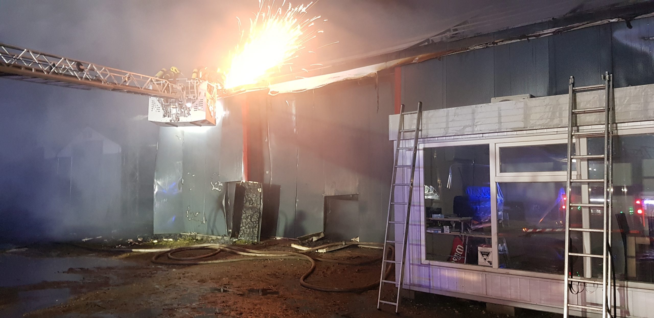 Dowodzący akcją podjął decyzję o wykonaniu otworów w ścianach, z płyty warstwowej w celu podawania prądów wody do wnętrza hali. Z uwagi na niestabilną konstrukcję stalową hali działania gaśnicze kontynuowane były z zewnątrz. W celu znalezieniu zarzewi ognia użyto kamery termowizyjnej oraz detektora prądu HOT STICK.