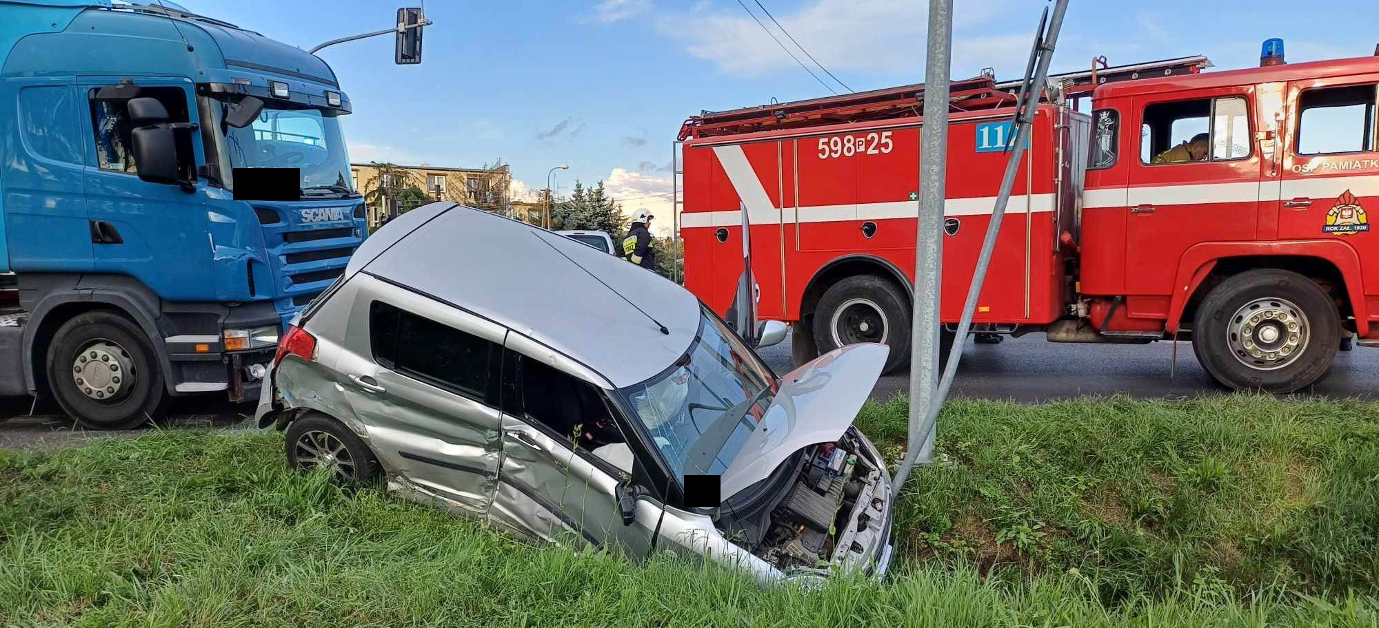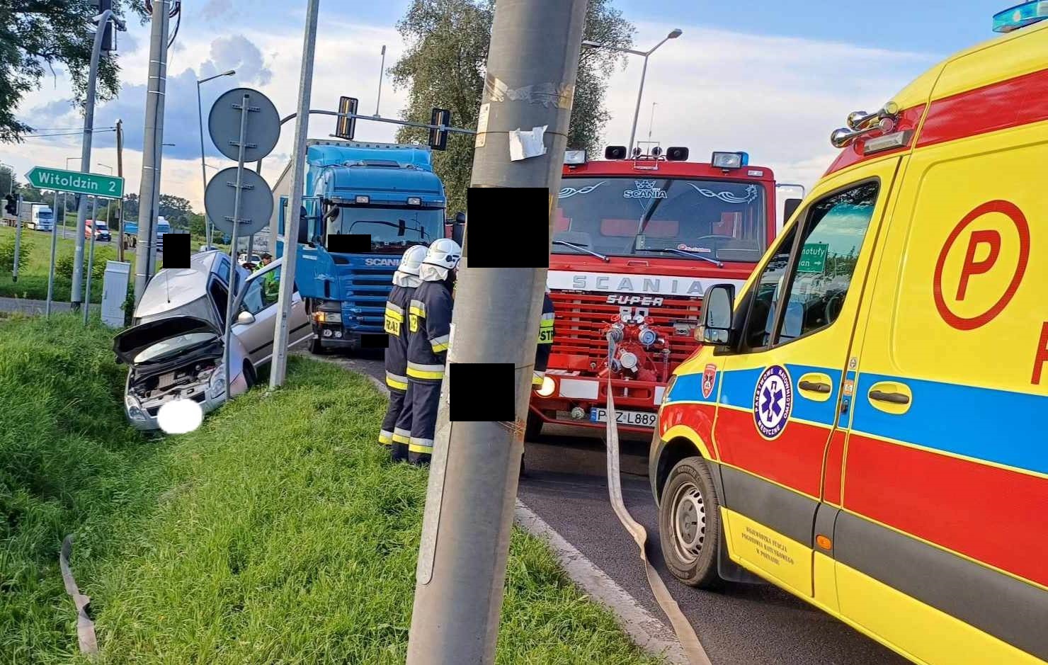 Pojazd marki Scania z naczepą znajdował się na środku skrzyżowania, natomiast Suzuki znajdowało się w przydrożnym rowie.