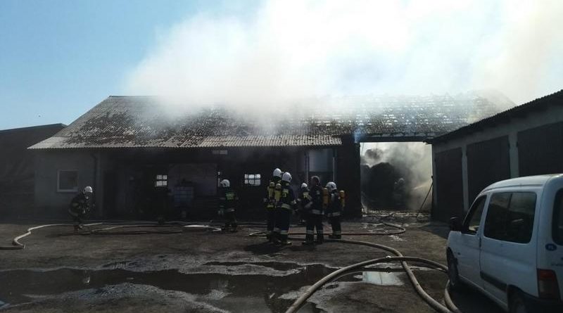 Potężny pożar budynku inwentarskiego! W akcji trwającej ponad 10 godz. uczestniczyło 7 zastępów PSP oraz 7 jednostek OSP razem-50 strażaków