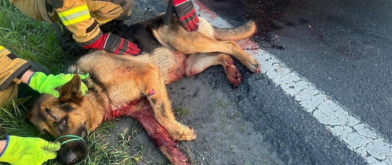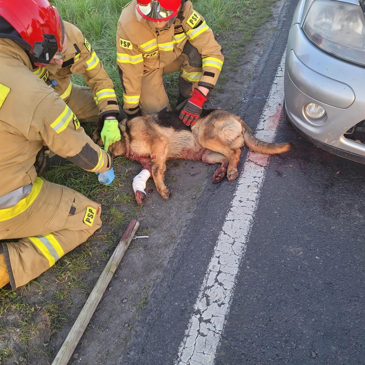 Psa ułożono na poboczu drogi gdzie wstępnie opatrzono ranę na łapie oraz podano mu wodę. Zwierzę zostało przekazane osobie ze Schroniska we Wrześni, która przybyła na miejsce zdarzenia