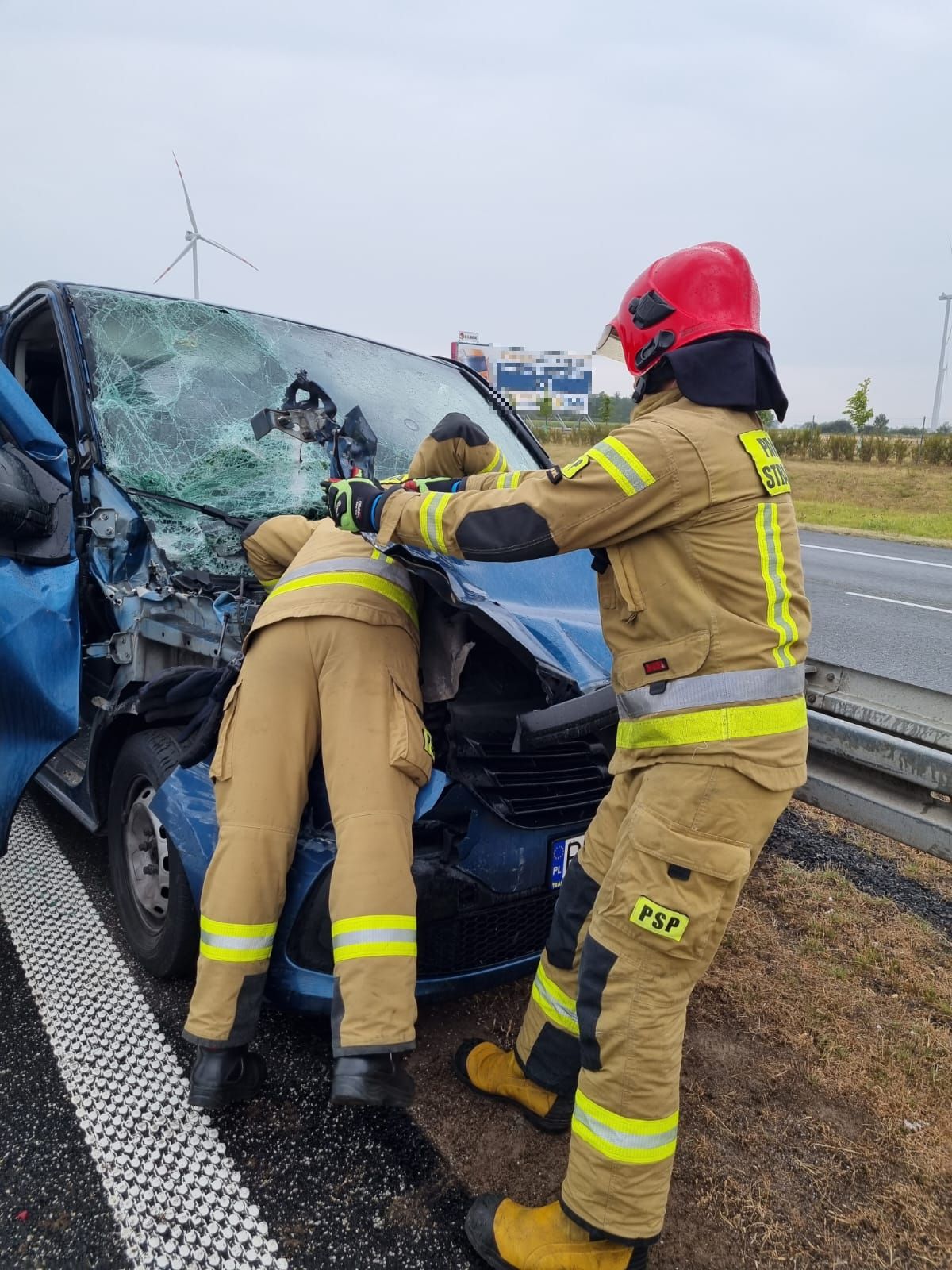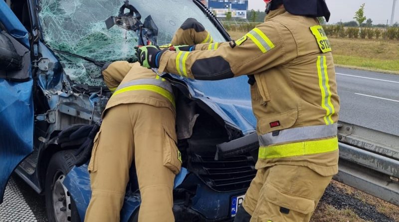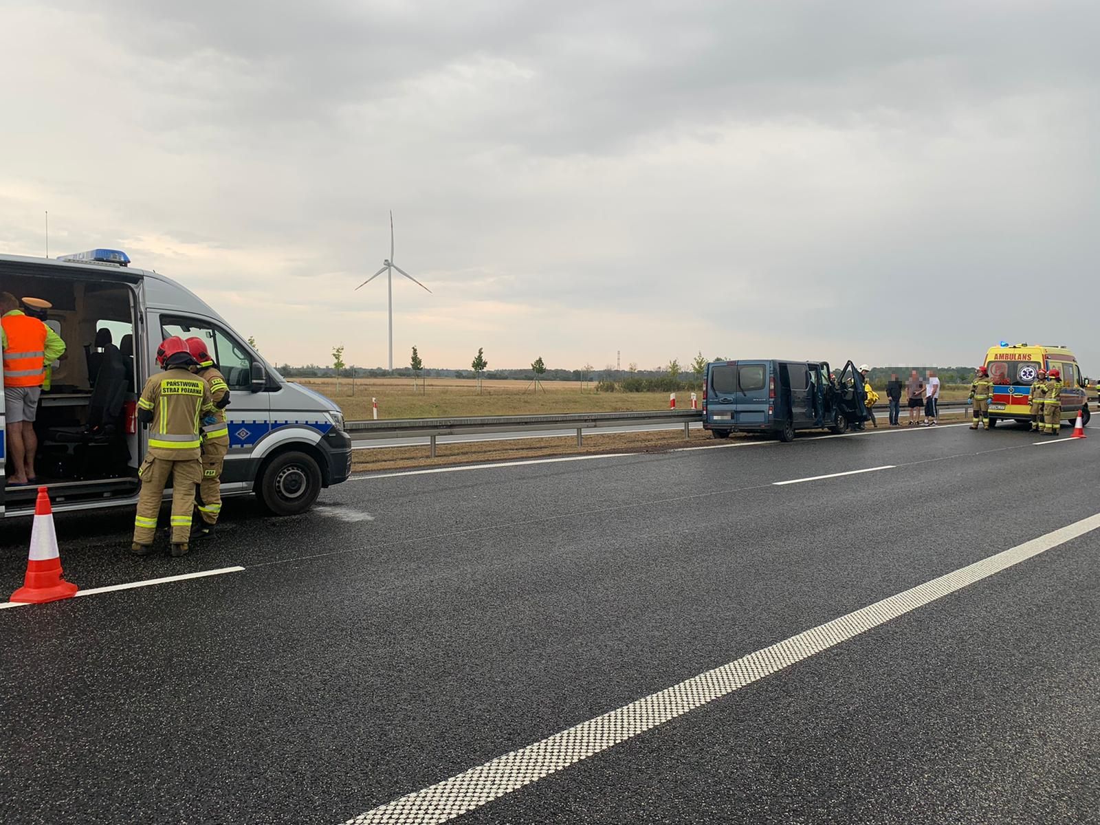 Dyżurny SKKP do zdarzenia zadysponował dwa zastępy ratownictwa technicznego z nowotomyskiej Jednostki Ratowniczo – Gaśniczej oraz zastęp Ochotniczej Straży Pożarnej z Kuślina. Po przyjeździe pierwszych zastępów na miejsca zdarzenia zastano samochód osobowy znajdujący się na lewym pasie autostrady przy barierze energochłonnej oraz 80m dalej samochód ciężarowy na pasie awaryjnym. Ośmiu podróżujących samochodem osobowym oraz kierowca samochodu ciężarowego opuścili pojazdy przed przybyciem zastępów straży pożarnej. Służby autostradowe znajdowały się już na miejscu zdarzenia. Ruch na nitce południowej w kierunku Warszawy odbywał się prawym pasem autostrady. Działania strażaków polegały na zabezpieczeniu miejsca zdarzenia, odłączeniu akumulatora w samochodzie osobowym oraz udzieleniu kwalifikowanej pierwszej pomocy poszkodowanym (kontrola ABC, wsparcie psychiczne, opatrzenie ran, stabilizacja odcinka szyjnego kręgosłupa, termoizolacja). Wszyscy poszkodowani zostali przekazani przybyłemu Zespołowi Ratownictwa Medycznego. Ratownik medyczny po przeprowadzonym badaniu poszkodowanych podjął decyzję o przetransportowaniu dwóch osób do szpitala w Nowym Tomyślu.