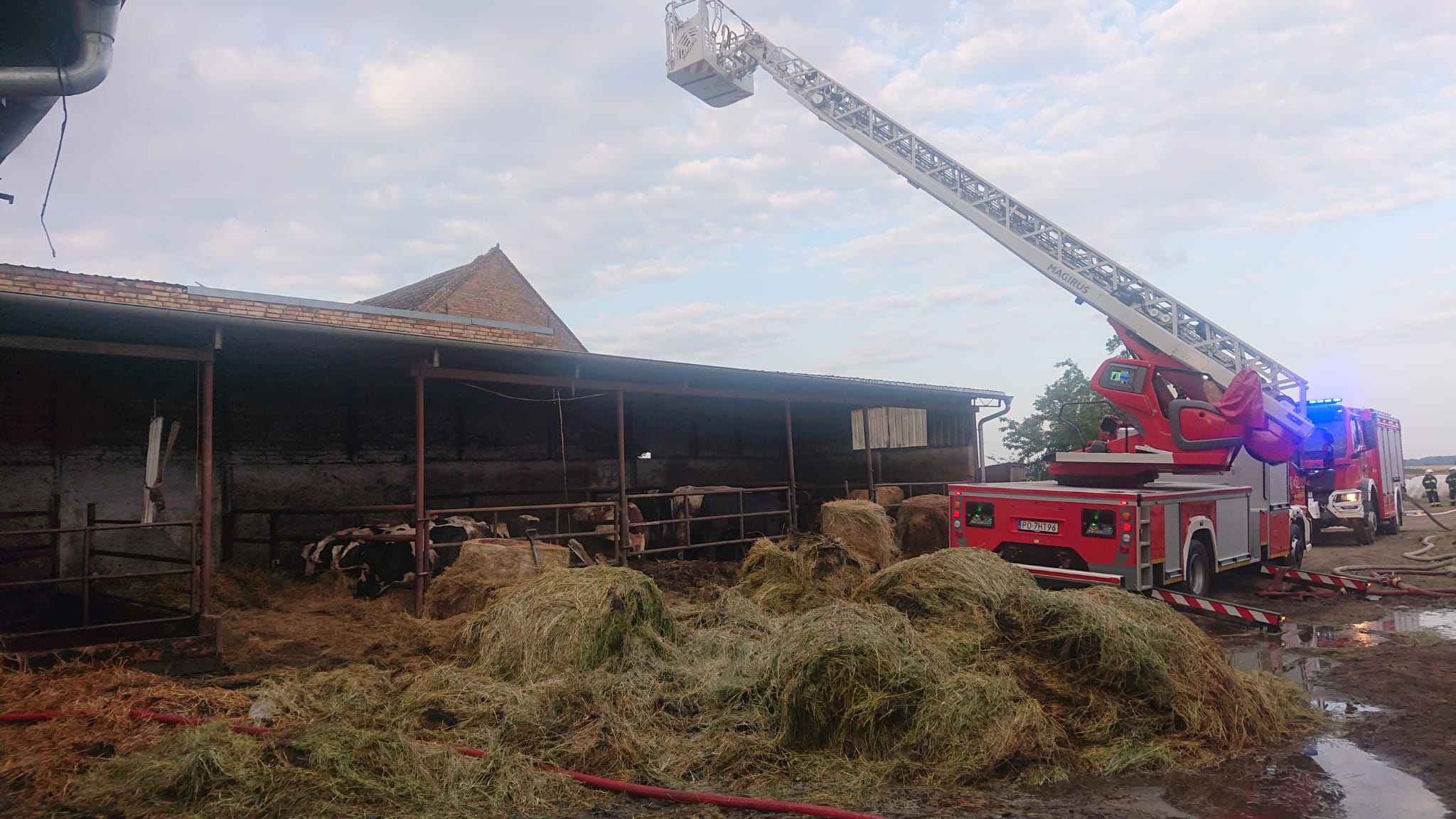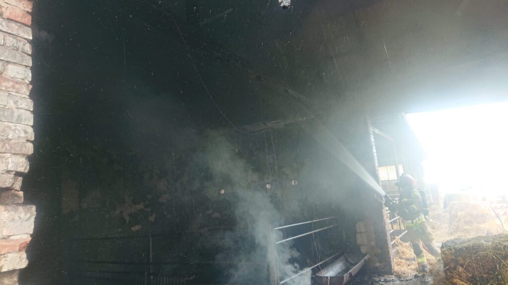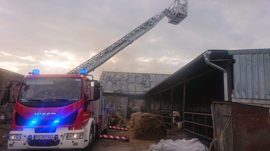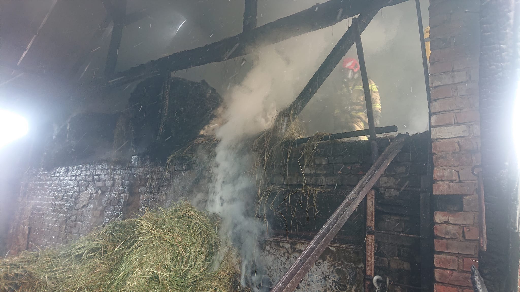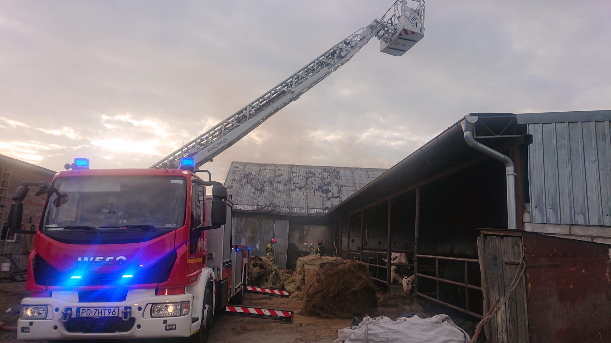 Po przybyciu na miejsce strażacy zastali rozwinięty pożar budynku, w którym znajdowało się bydło, kurczaki oraz składowane było siano.