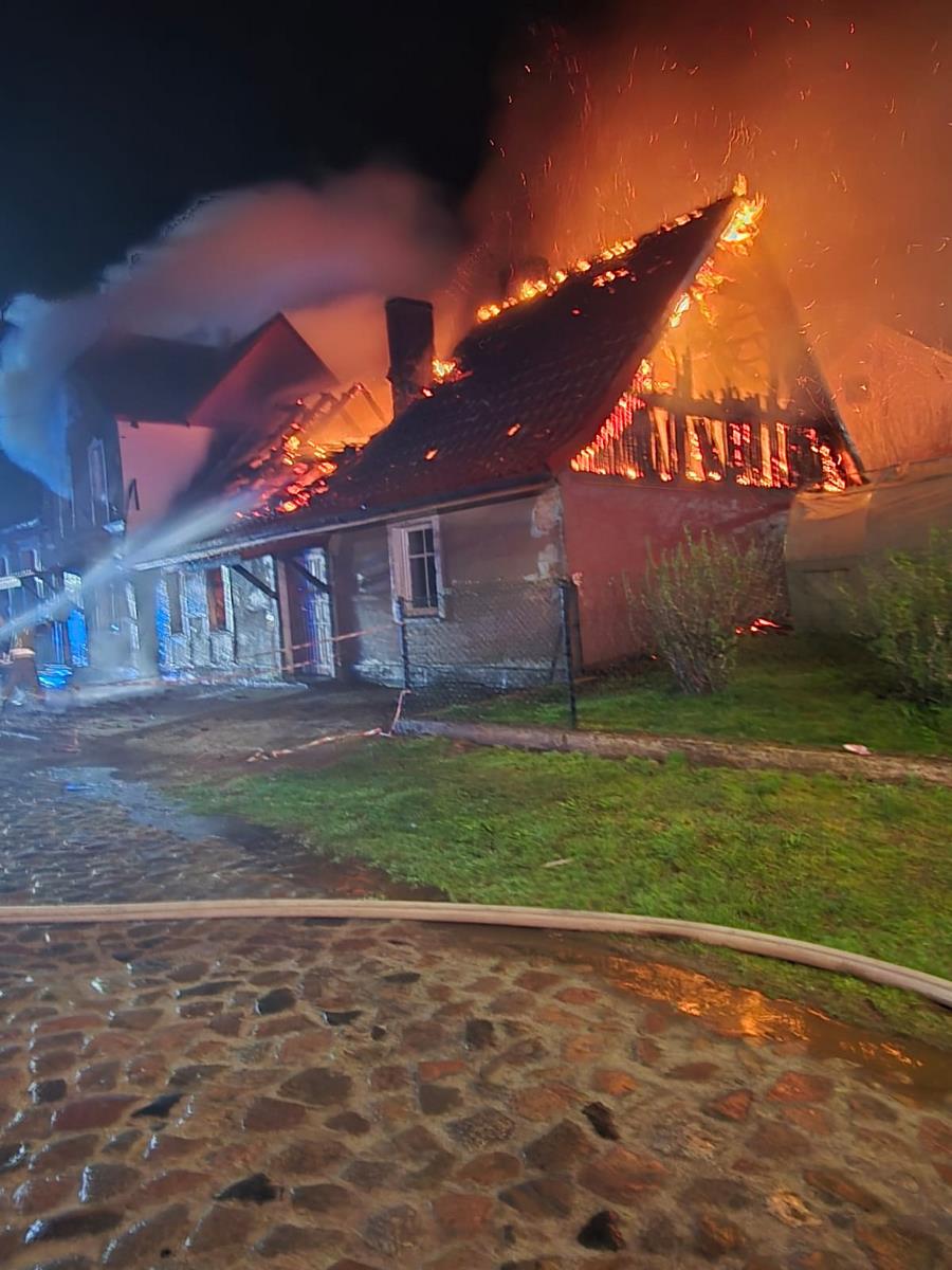 Z chwilą przybycia na miejsce zdarzenia pierwszych zastępów straży pożarnej potwierdzono pożar – dach i część budynku objęta była płomieniami wychodzącymi przez otwory okienne. W bezpośrednim pobliżu przebywał mężczyzna, który był w budynku w chwili powstania pożaru i samodzielnie się ewakuował przed przybyciem straży.