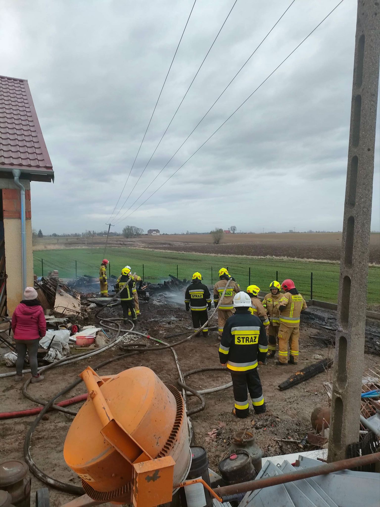 Po przybyciu pierwszego zastępu na miejsce zdarzenia, stwierdzono rozwinięty pożar belek drewnianych za budynkiem gospodarczym. Działania polegały na zabezpieczeniu miejsca zdarzenia, podaniu dwóch prądów wody w natarciu na palące się belki, zbudowania zasilania wodnego z pobliskiego hydrantu, rozgarnięciu pogorzeliska oraz dokładnym sprawdzeniu całości kamerą termowizyjną. Na miejsce zdarzenia zadysponowano także Pogotowie Energetyczne, które nie stwierdziło uszkodzenia linii energetycznych, które znajdowały się nad pogorzeliskiem.