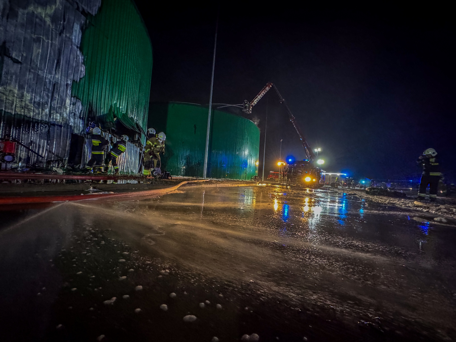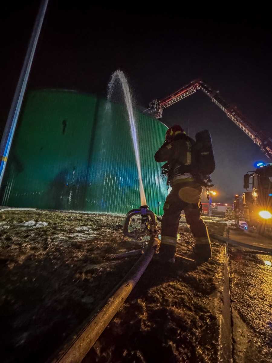Działania straży pożarnej polegały na zabezpieczeniu miejsca zdarzenia, następnie wyznaczona rota pomiarowa dokonała weryfikacji zagrożenia związanego z niekontrolowanym uwolnieniem się metanu do atmosfery w obrębie zbiorników. Z uwagi na wskazania urządzeń pomiarowych oraz na podstawie pozyskanych informacji KDR podjął decyzję o wprowadzeniu zastępów do działań, które polegały na podawaniu środków gaśniczych w natarciu na palące się obiekty oraz obronie zagrożonych zbiorników. Działania gaśnicze prowadzone były z wykorzystaniem podnośników hydraulicznych oraz działka przenośnego. Wraz z przybyciem kolejnych zastępów w tym jednostek spoza powiatu krotoszyńskiego tj. jednostek wchodzących w skład plutonu wsparcia z powiatu jarocińskiego oraz autocysterny z JRG Ostrów Wielkopolski zwiększono intensywność podawania środka gaśniczego. Do działań skierowana została Specjalistyczna Grupa Ratownictwa Chemiczno-Ekologicznego z JRG Ostrów Wielkopolski, której zadaniem było przede wszystkim rozpoznanie zagrożenia i monitorowanie strefy zagrożenia. Dużym wsparciem KDR-a był zadysponowany do działań samochód dowodzenia i łączności z KM PSP w Kaliszu, którego wykorzystano m.in. do koordynacji Sił i Środków oraz potencjału ratowniczego zaangażowanego do likwidacji zagrożenia. Po dotarciu ma miejsce Grupy Operacyjnej Wielkopolskiego Komendanta Wojewódzkiego batalionowym samochodem dowodzenia i łączności do działań wprowadzono bezzałogowy statek powietrzny z termowizją lokalizując miejsca o podwyższonej temperaturze głównie w przestrzeniach niedostępnych dla ratowników, które systematycznie dogaszano. Obrany zamiar taktyczny doprowadził do szybkiej lokalizacji zdarzenia i skutecznej obrony zagrożonych obiektów. W momencie całkowitej likwidacji zagrożenia potwierdzonej przez pomiary termowizji z wykorzystaniem drona oraz urządzeń pomiarowych działania straży pożarnej zakończono i zastępy wróciły do miejsca stacjonowania.