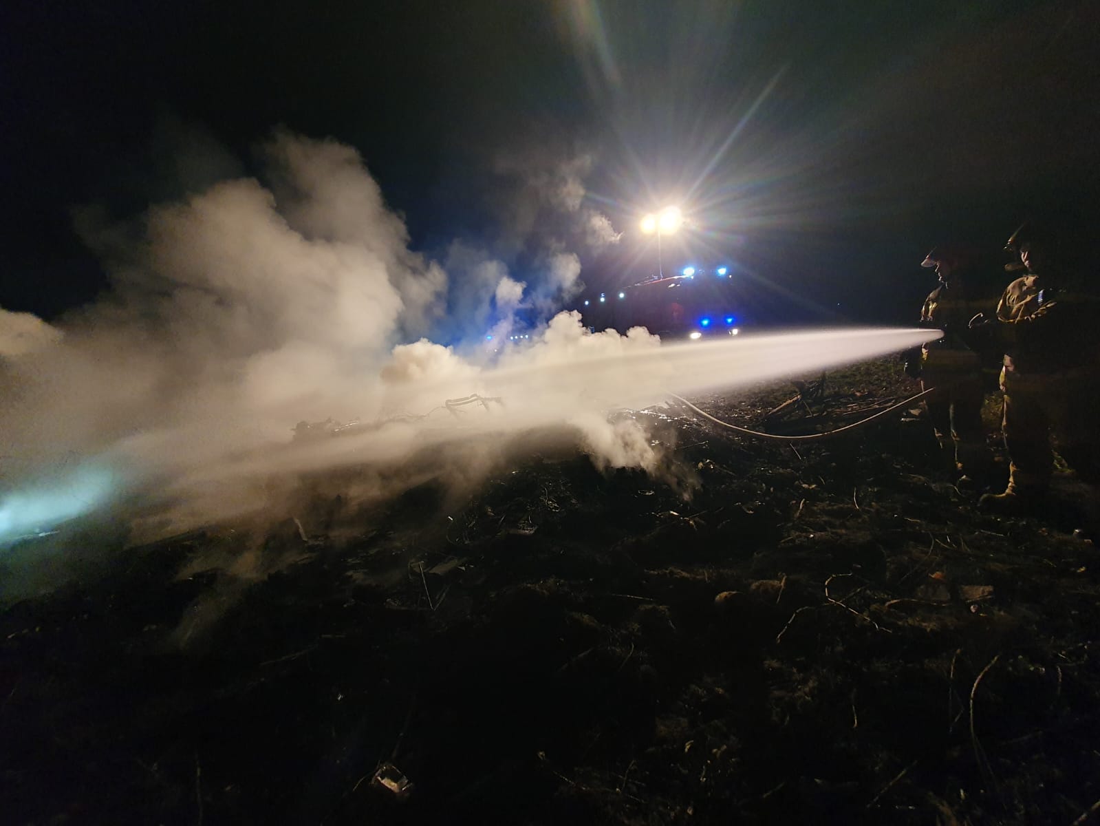 Działania straży pożarnej polegały na zabezpieczeniu miejsca zdarzenia, podaniu jednego prądu wody w natarciu na palące się składowisko części.