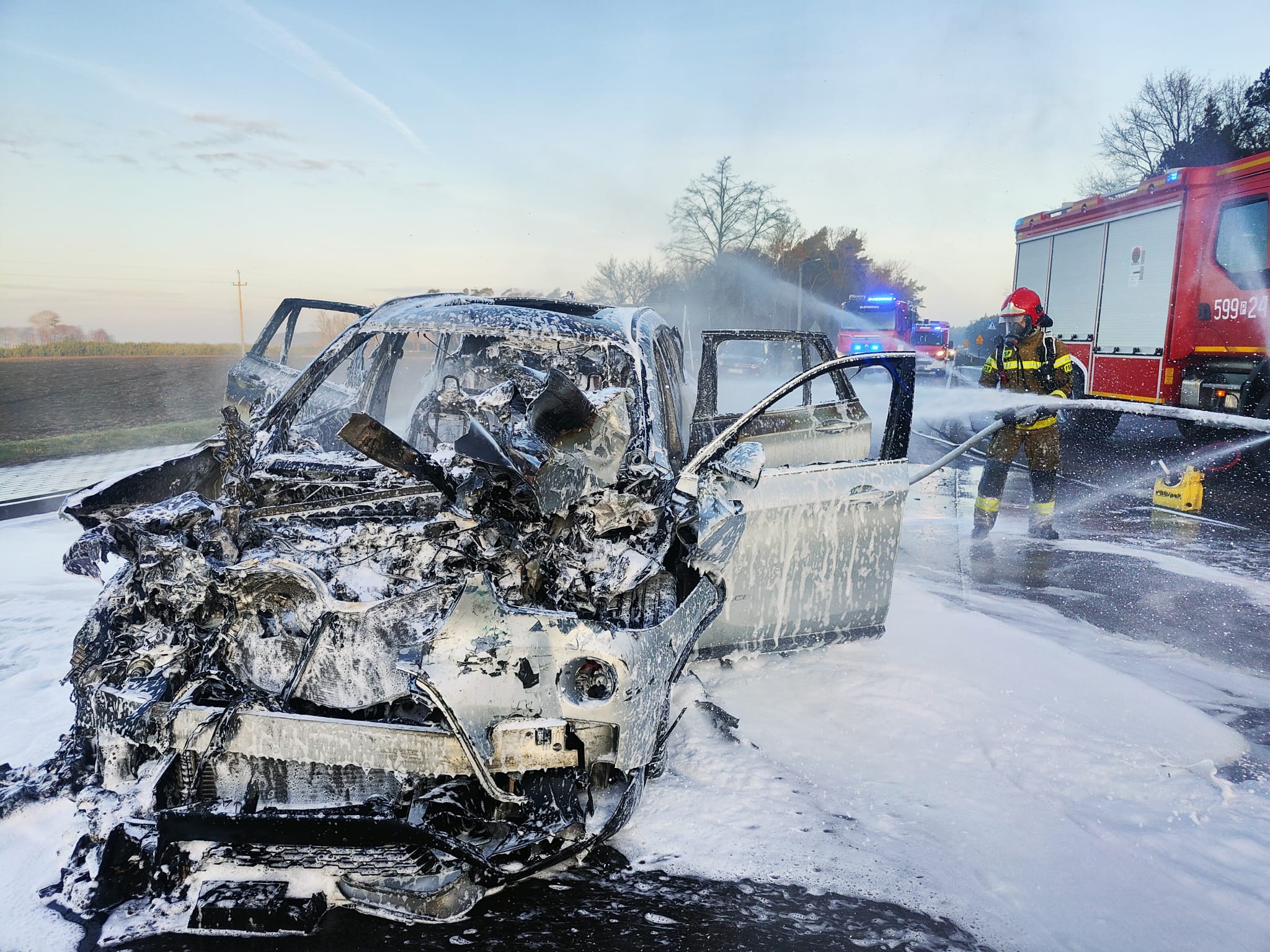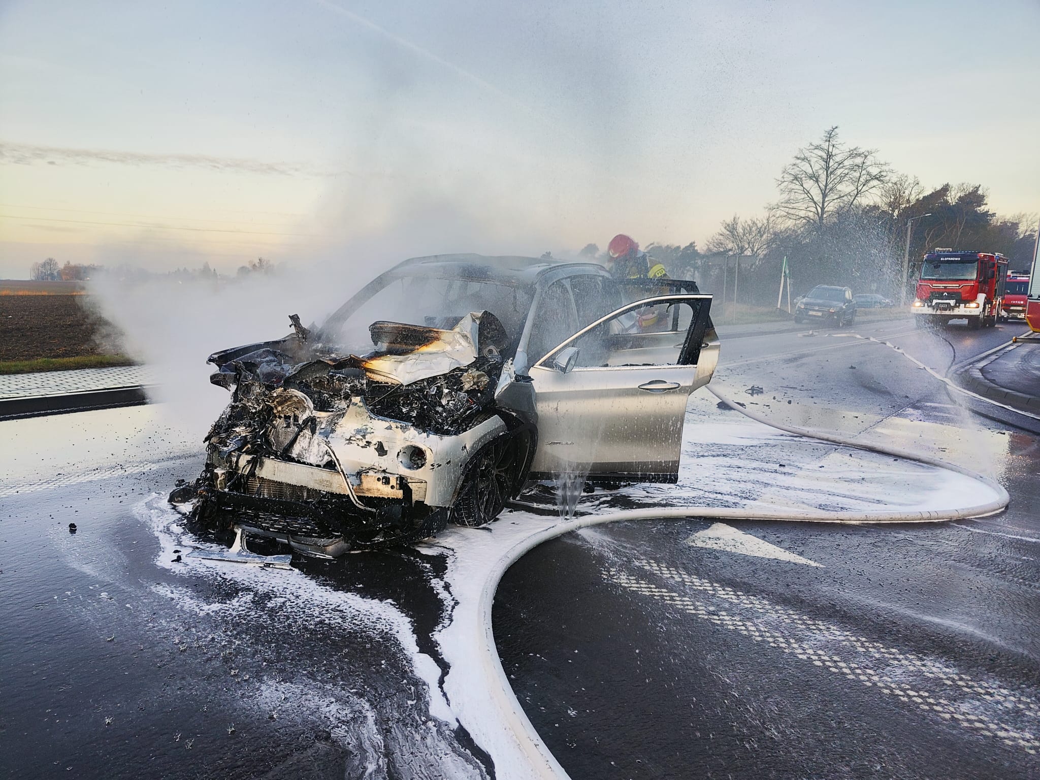 Po dojeździe na miejsce zdarzenia strażacy zastali samochód osobowy marki BMW, który uderzył w tył autobusu. W wyniku zdarzenia doszło do pożaru samochodu osobowego, który znajdował się na drodze. Kierujący opuścili pojazdy przed przybyciem SP i znajdowali się pod opieką świadków zdarzenia.