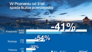 Analizując sześć podstawowych kategorii kryminalnych na przestrzeni ostatnich czterech latach, widać wyraźnie, że spadek przestępczości na terenie Miasta Poznania wynosi aż 38%. Odnotowano o 40% mniej kradzieży, o 16% mniej kradzieży samochodów, a liczba kradzieży z włamaniem spadła o prawie 45%. O ponad 50% zmniejszyły się rozboje i tzw. wymuszenia rozbójnicze. Mniej było również bójek – spadek o 33%.