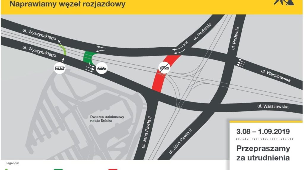 Najważniejsze zmiany będą przeprowadzone jednak na rondzie Śródka. Zamknięty zostanie ruch tramwajowy od strony ul. Wyszyńskiego, co uniemożliwi bezpośredni przejazd w relacji Podwale – Jana Pawła II oraz Warszawska – Jana Pawła II. Aby dostać się w kierunku ul. Jana Pawła II stworzona zostanie przewiązka usytuowana za przystankiem tramwajowym na ul. Wyszyńskiego.
